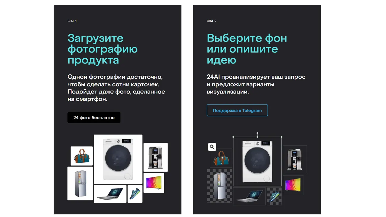 Сервис 24AI позволяет работать с различными размерами и стилями изображений, помогает продавцам на маркетплейса выделяться на фоне конкурентов и экономит время и деньги на студийной фотосъемке.