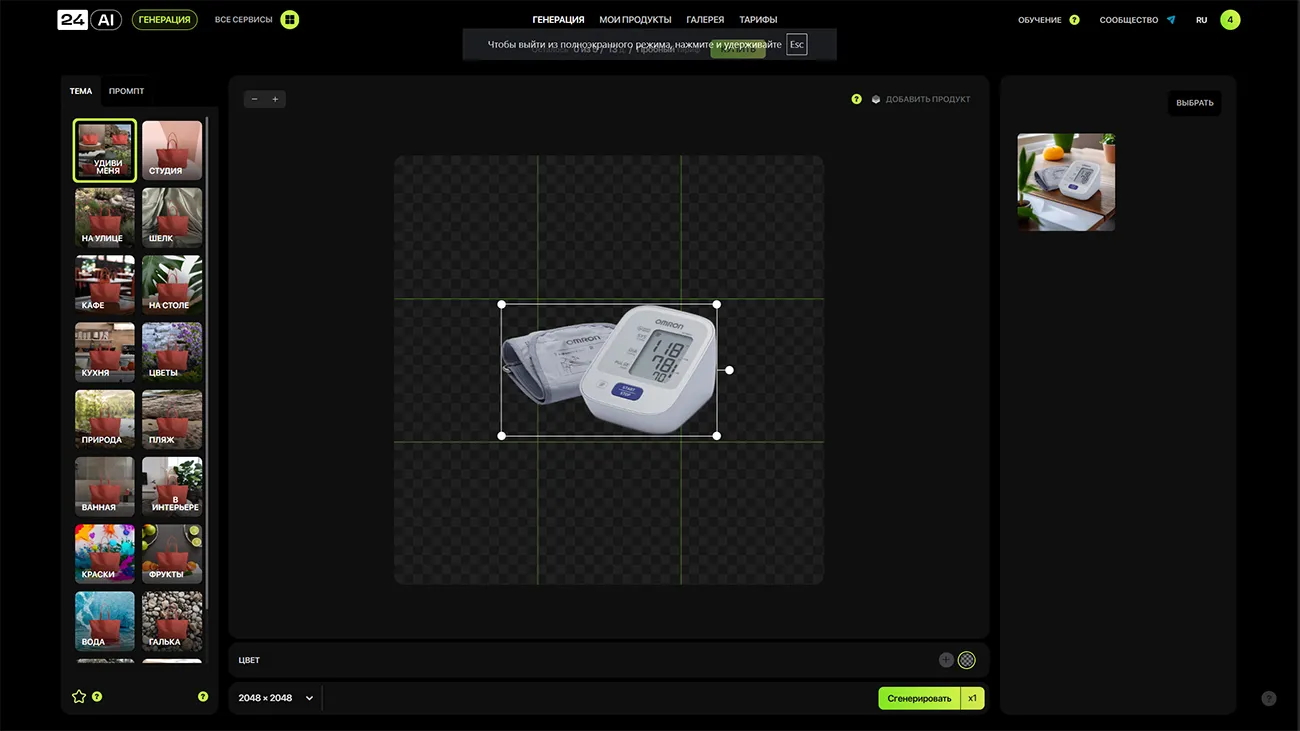 Оцените возможности фоторедактора с искусственным интеллектом, который позволяет быстро преобразовать обычные фото в качественные изображения для маркетплейсов и рекламы. С его помощью можно менять фоны, добавлять уникальные элементы и выбирать стиль оформления. Искусственный интеллект автоматически адаптирует изображения для нужного формата, обеспечивая профессиональный результат даже без навыков редактирования. Такой подход упрощает подготовку визуального контента, экономя время и усилия, при этом улучшая качество презентации продуктов.
