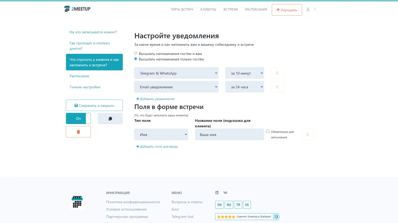 Одно из преимуществ 2meetup – внешний вид уведомлений, которые не выглядят как спам и пишутся только на русском языке. В тарифе «Премиум» вы можете самостоятельно создать текст сообщения, например «Здравствуйте! Напоминаю о том, что завтра в 12.30 у нас сеанс. Все в силе?». Это выглядит как личная переписка и вызывает доверие у клиентов. Если человек пропустил напоминание, сервис пришлет новое оповещение в мессенджер или позвонит лично.