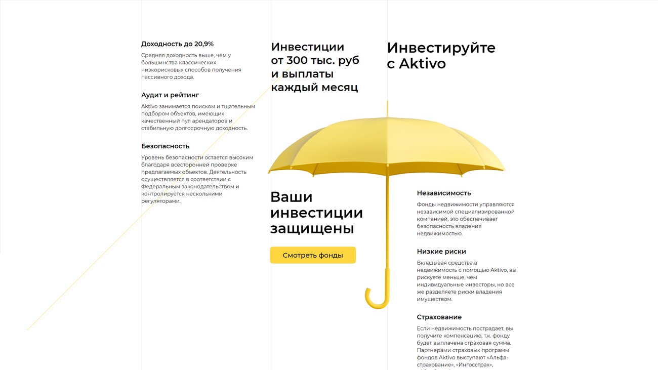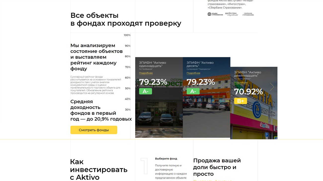 Страхование является важным инструментом для снижения рисков инвестирования в профессиональную недвижимость. Aktivo ведет сотрудничество с несколькими крупными страховыми компаниями, включая «Альфа-страхование», «Ингосстрах» и «Сбербанк Страхование», что позволяет инвесторам защитить свои вложения от непредвиденных обстоятельств.