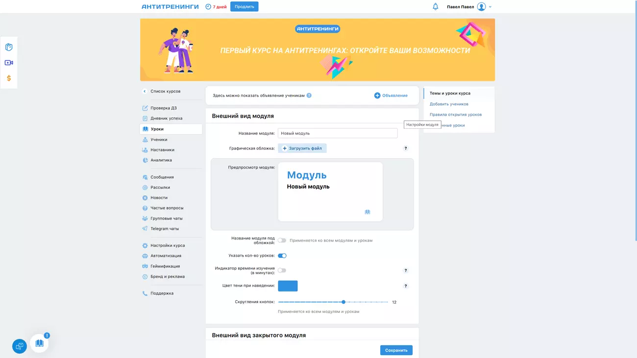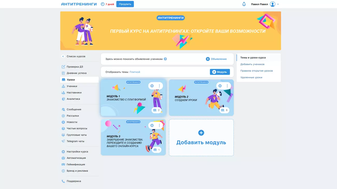Antitreningi — это мощная платформа для создания, управления и продвижения онлайн-курсов. Она предлагает инструменты для обучения, аналитики и автоматизации, позволяя создавать эффективные образовательные проекты и монетизировать знания.