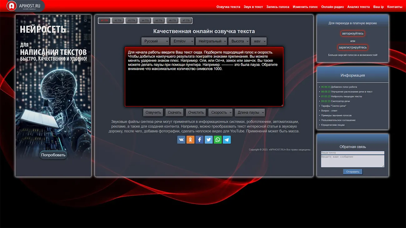 Бесплатные голоса расположены под кнопкой V1 TTS, находящейся в верхней части сайта. Она доступна при вводе текста до 1000 знаков, полученных с одного IP-адреса. При этом учитывается, что возможно использование дополнительных символов в виде ударения и пауз. Для замера количества символов на сервисе представлен инструмент «Анализ текста». На расположенных под текстовым полем кнопках устанавливается скорость речи, с возможным замедлением или ускорением.