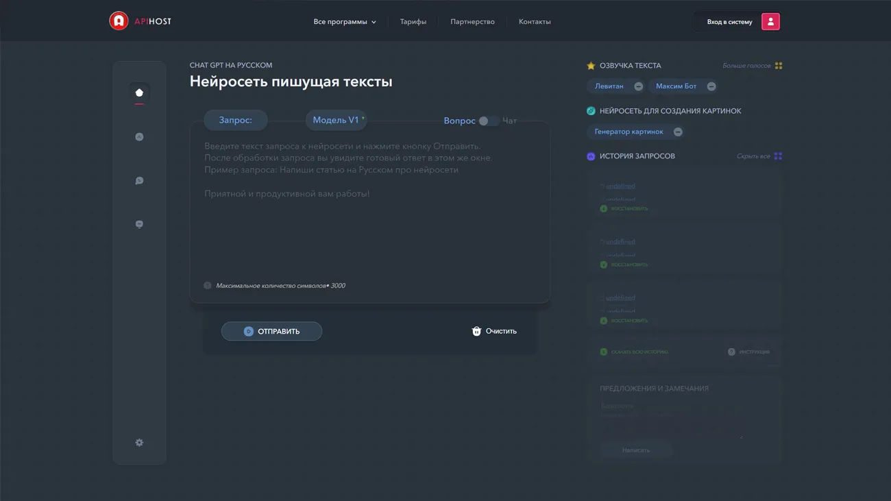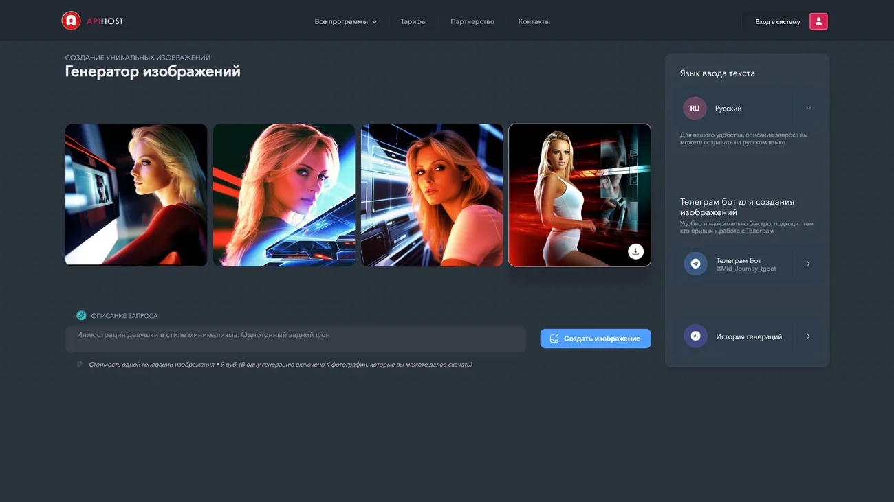 На сервисе Apihost предусмотрена возможность генерации изображений с помощью нейросети по введенному запросу. Также предоставляется право для пользователя воспользоваться услугами посредника при оплате зарубежных сервисов (DropBox, Zoom, Figma и другие).