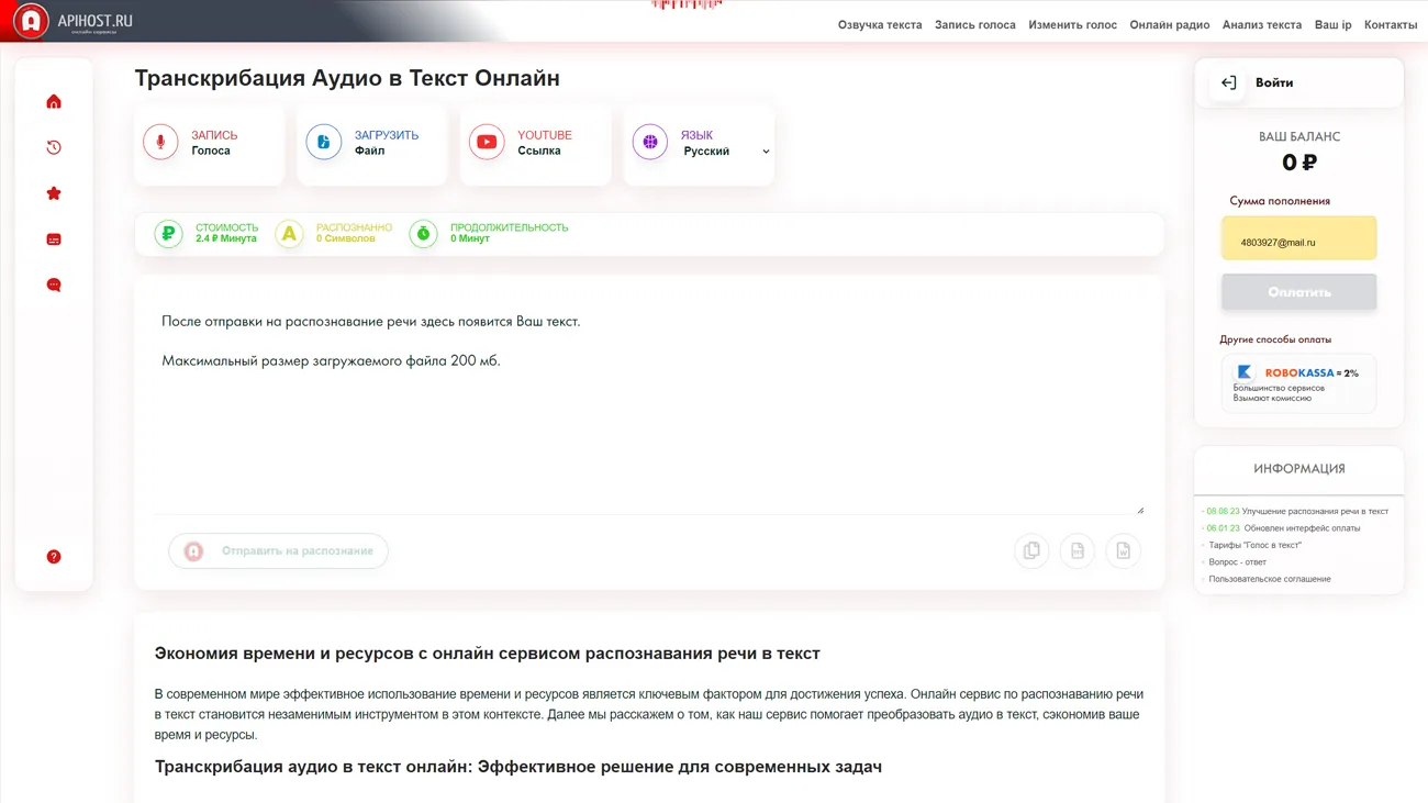 - Обратный перевод речи в текст в Apihost. Возможно извлечение текста как из аудиофайлов размером до 200 МБ с экспортом результата в форматы txt или rtf, так и преобразование речи в текст с использованием диктофона в онлайн-режиме.