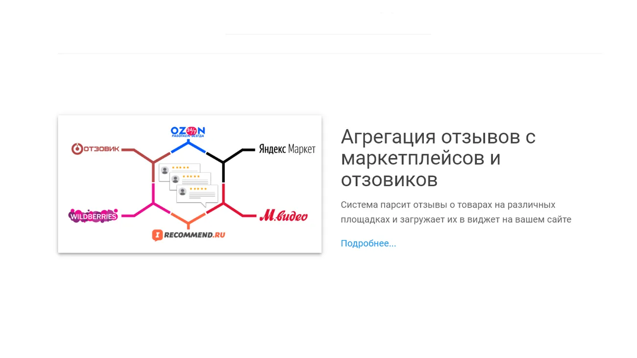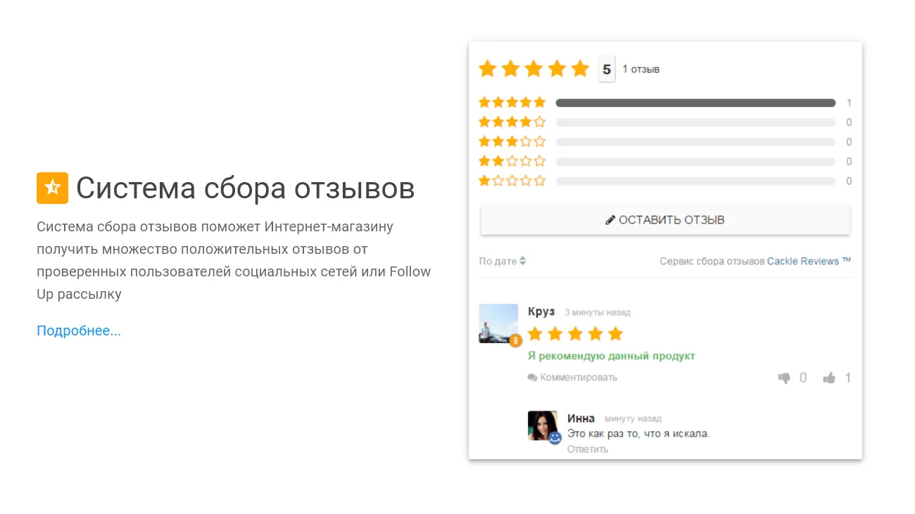 Приложение собирает отзывы на ваши товары с разных площадок и выводит их на основном сайте магазина. Это помогает повысить узнаваемость бренда и увеличить доверие аудитории. Все отзывы индексируются поисковыми системами.