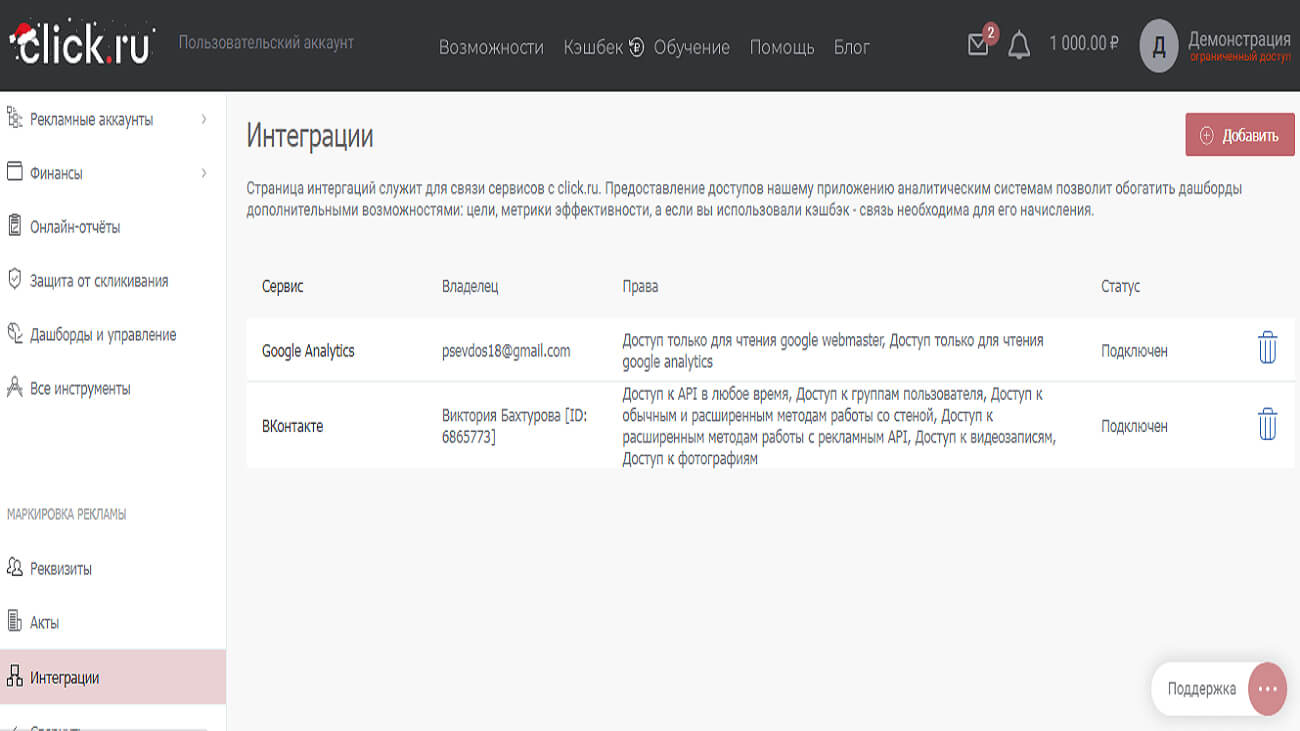 Для повышения эффективности работы с дашбордами сервис предоставляет возможность интеграции с такими крупнейшими рекламными системами как Google Аналитика, Яндекс Метрика и социальная сеть ВКонтакте.