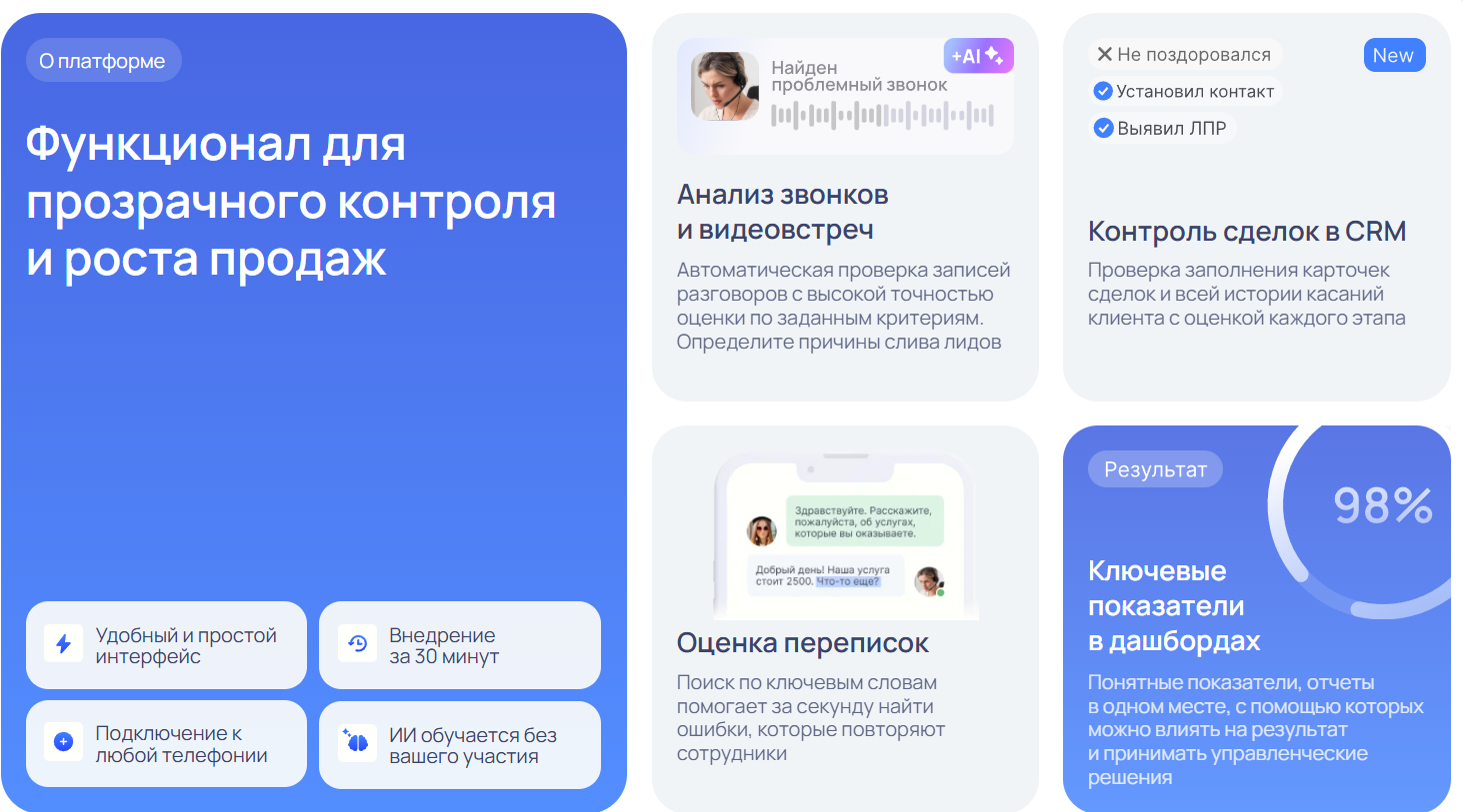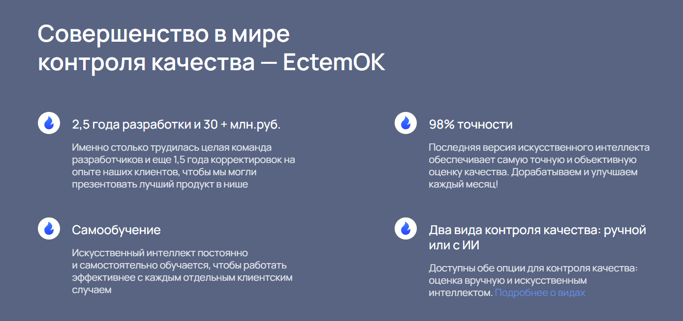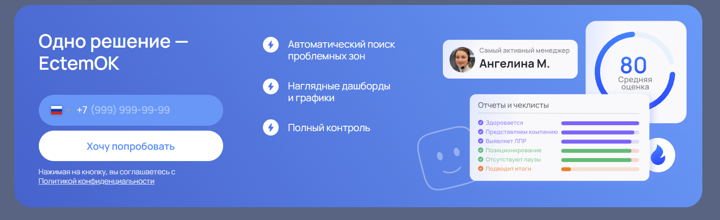 Платформа ectem OK позволяет автоматически выгружать и оценивать звонки по индивидуальным чек-листам, анализировать работу менеджеров, выявлять слабые места и принимать управленческие решения. В системе есть гибкие фильтры, теги, графики и дашборды для мониторинга эффективности, а также возможность интеграции с CRM и расширениями для оценки карточек сделок.