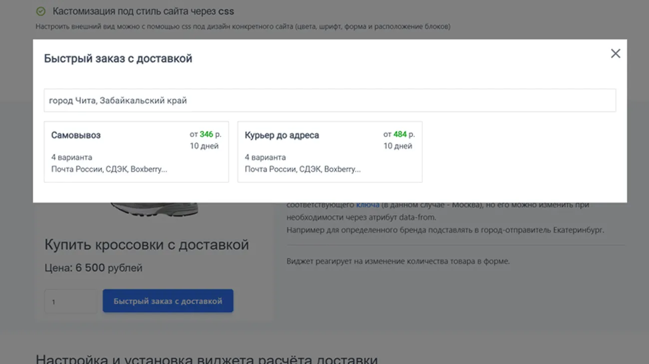 Калькулятор расчета доставки устанавливается на странице с карточкой товара или или на странице доставки. Виджет откроется при клике на кнопку. Покупателю доступен выбор следующих элементов: