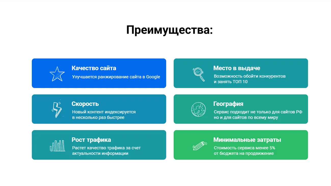 - Ускорение индексации: Fast Indexing позволяет добавлять страницы в индекс поисковых систем в кратчайшие сроки.