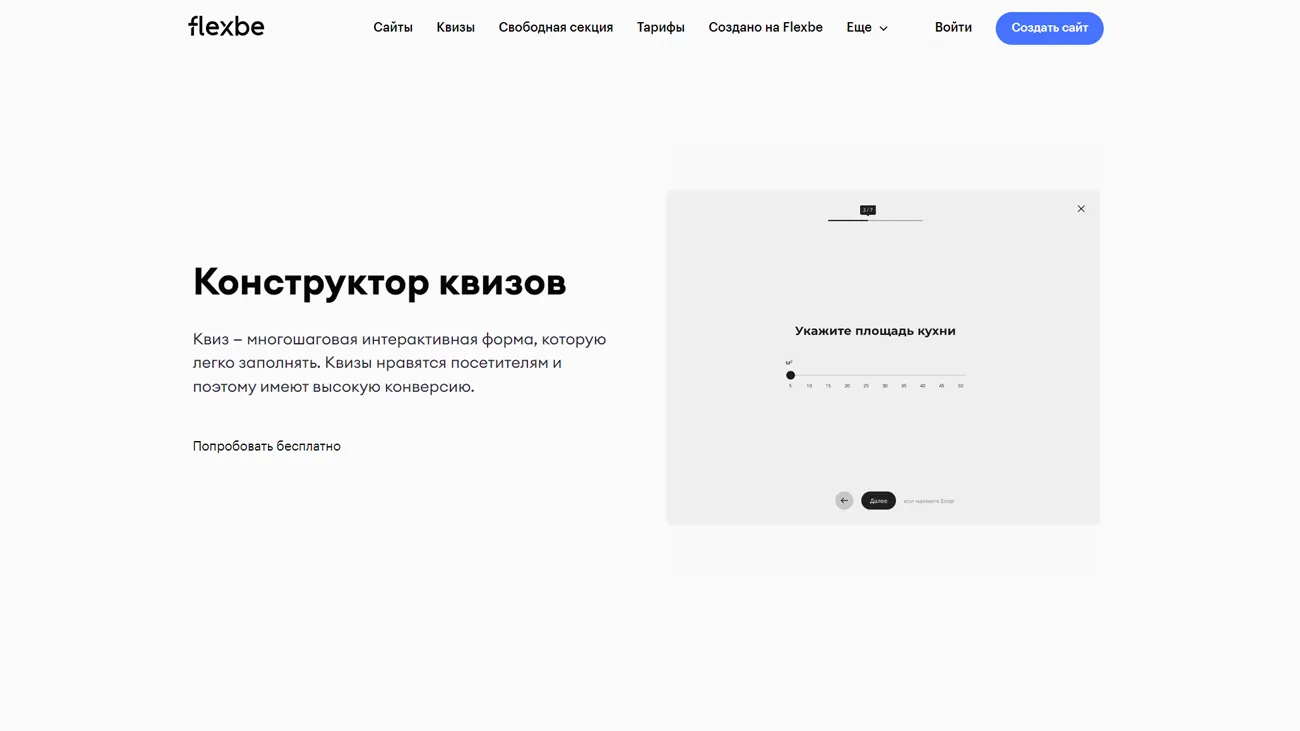 Flexbe предлагает создание многошагового интерактивного теста для увеличения конверсии. Пользователю сервиса доступен следующий функционал: