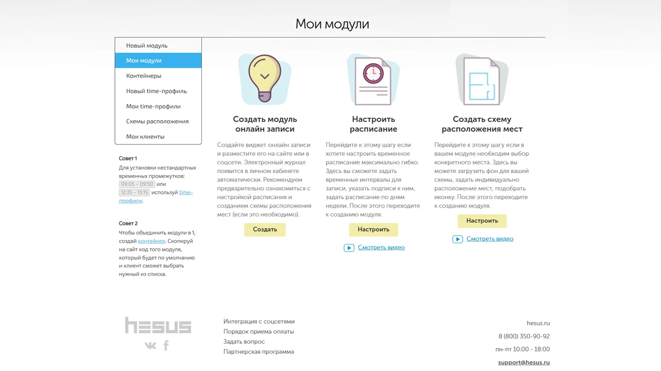 Hesus — это универсальное решение для управления процессами онлайн-бронирования, которое охватывает все этапы взаимодействия с клиентами. Прием оплаты на сайте через платежные системы, электронный журнал записи с возможностью редактирования и экспорта в Excel формат, СМС-информирование клиентов и владельца.