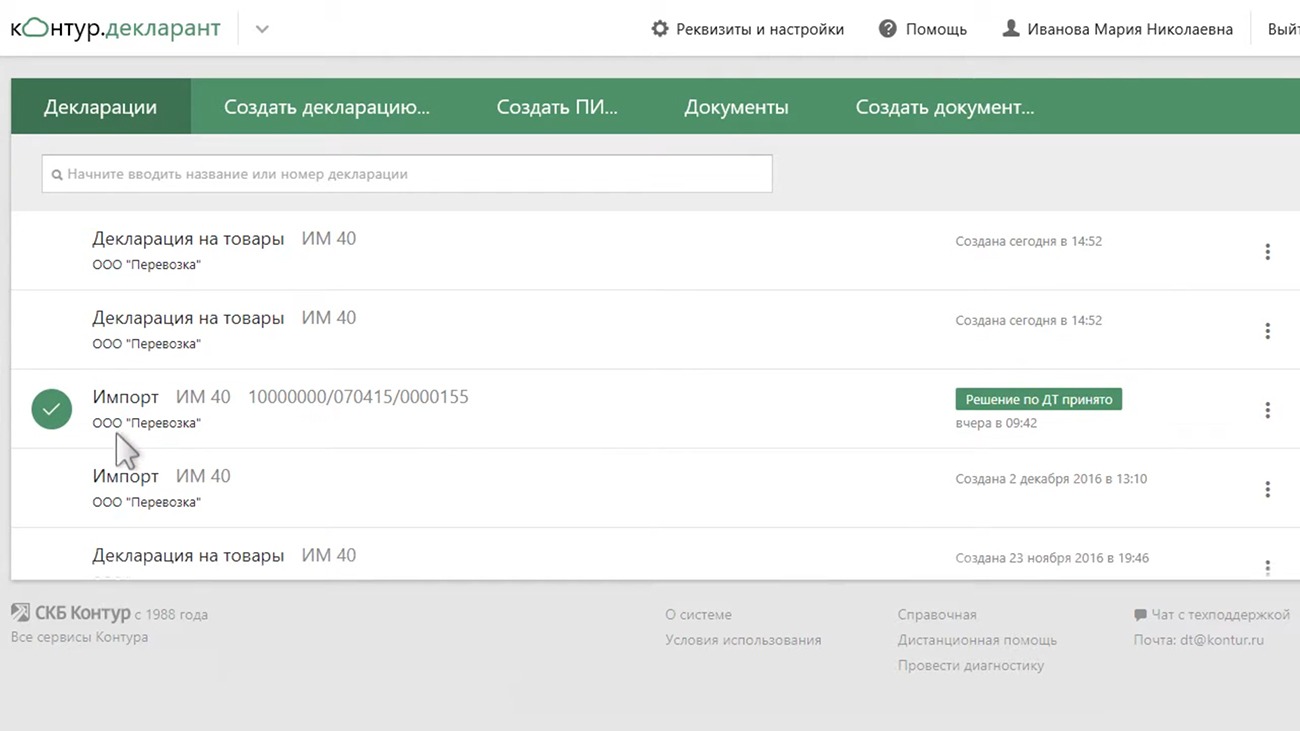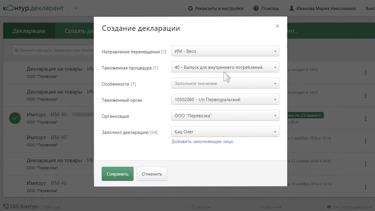 Kontur.Declarant также позволяет пользователям сотрудничать с коллегами, создавать, отправлять и отслеживать таможенные декларации в едином рабочем пространстве. Кроме того, клиенты могут получить доступ к сервису, чтобы отслеживать свои декларации и подписывать документы с помощью персональной электронной подписи.