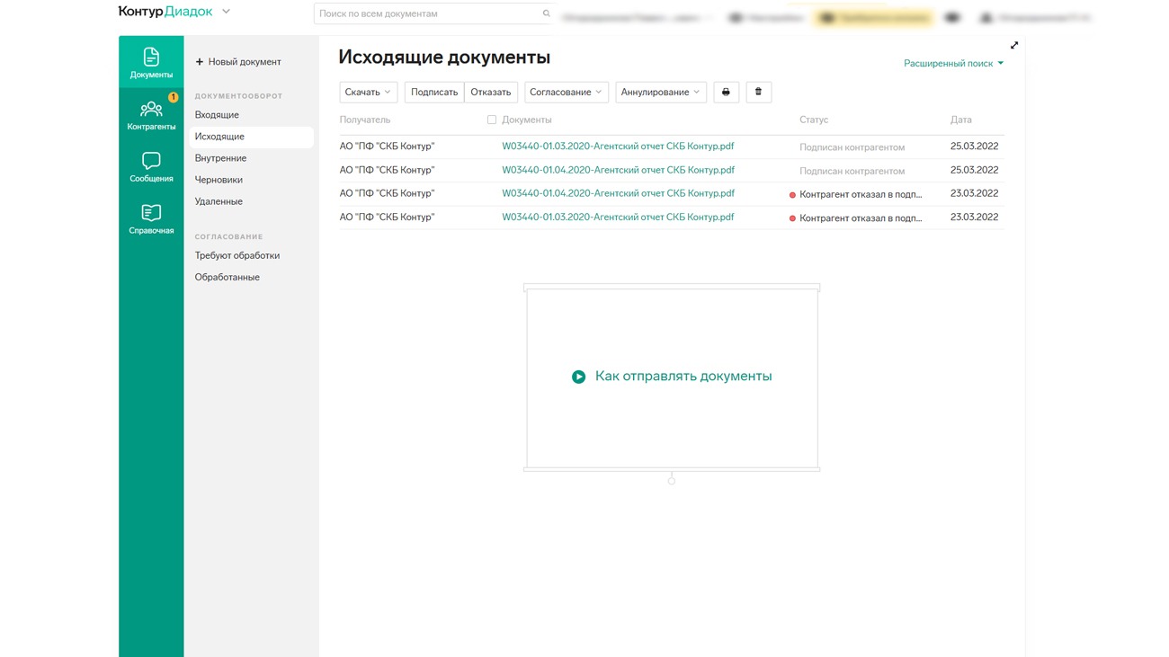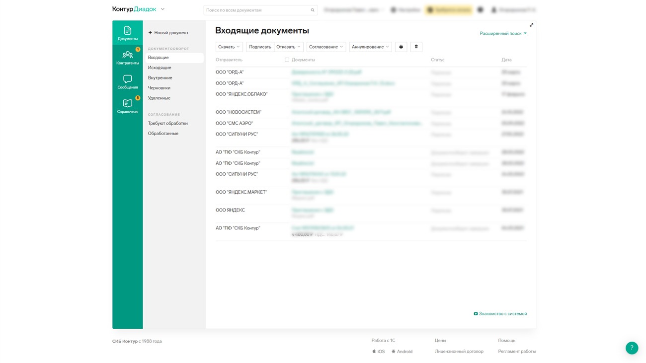 Контур Диадок (ЭДО) позволяет контролировать статус документов, таких как доставлено, подписано или отклонено. Это помогает избежать недоразумений с контрагентами и увеличить входной НДС. Электронные документы, подписанные с помощью квалифицированной электронной подписи (КЭП), имеют ту же юридическую силу, что и бумажные документы, и не требуют дополнительных расходов на их печать.