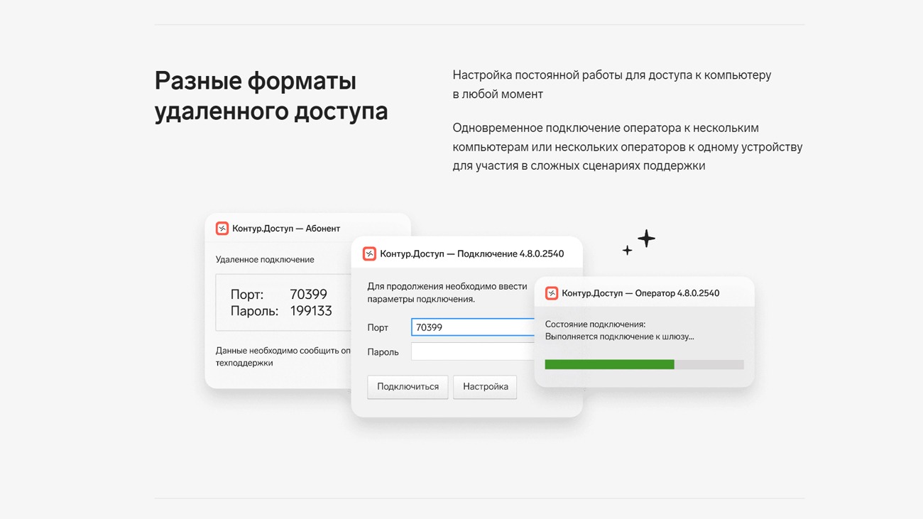Одной из ключевых особенностей Контур Доступ является стабильность соединения. Сервис предназначен для автоматической стабилизации соединений после отключения или перезагрузки, обеспечивая бесперебойный доступ к удаленным компьютерам.