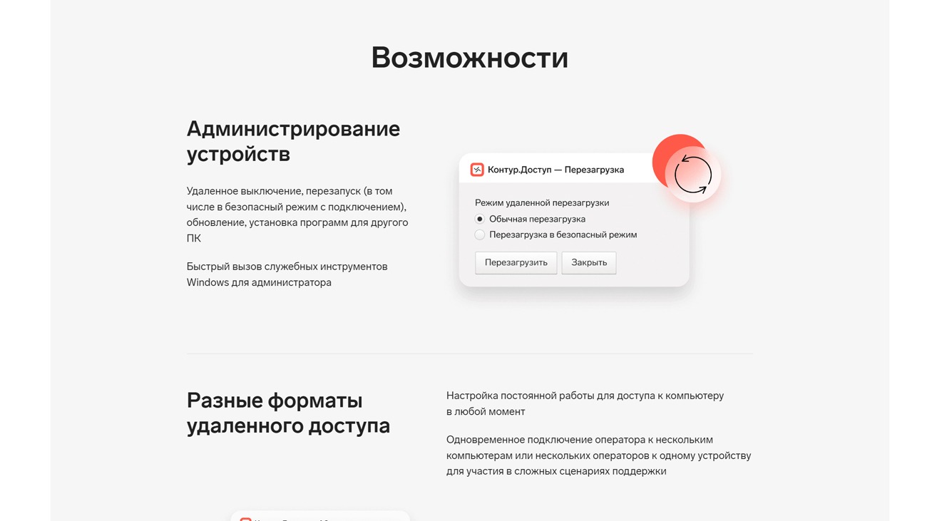 Контур Доступ особенно полезен для администрирования устройств, поскольку позволяет администраторам удаленно управлять другими компьютерами, включая выключение, перезагрузку, обновление и установку программ.