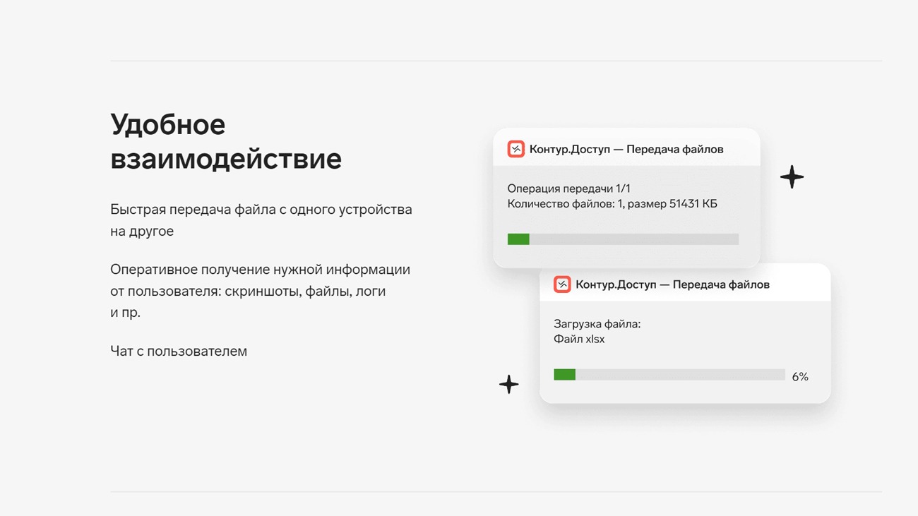 Кроме того, Контур Доступ предлагает быструю передачу файлов и позволяет оперативно получать всю необходимую информацию от удаленных пользователей, включая снимки экрана, файлы и журналы событий. Сервис также позволяет общаться с удаленным пользователем в чате, что облегчает оказание технической поддержки и устранение неполадок.
