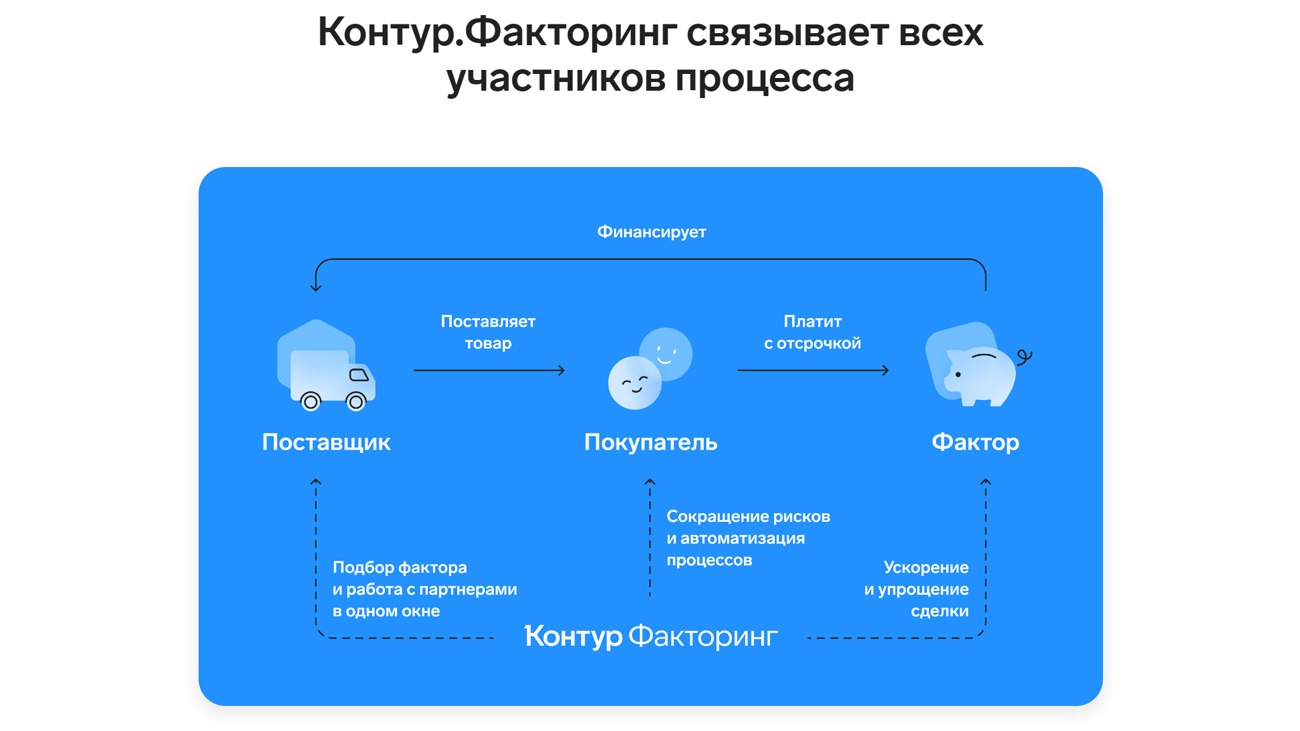 Принцип работы Контур.Факторинг заключается в том, что сервис связывает всех участников процесса - поставщиков, покупателей и факторинговые компании. Поставщики могут выбрать любую из 50+ факторинговых компаний с выгодными условиями финансирования. Затем они могут подать заявку на факторинг и загрузить документы, связанные со сделкой, прямо на сайте с помощью системы электронного документооборота.