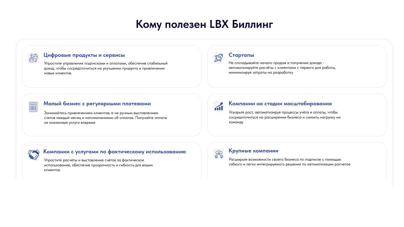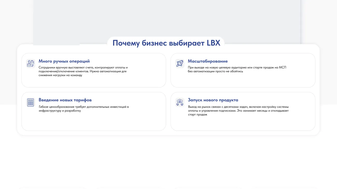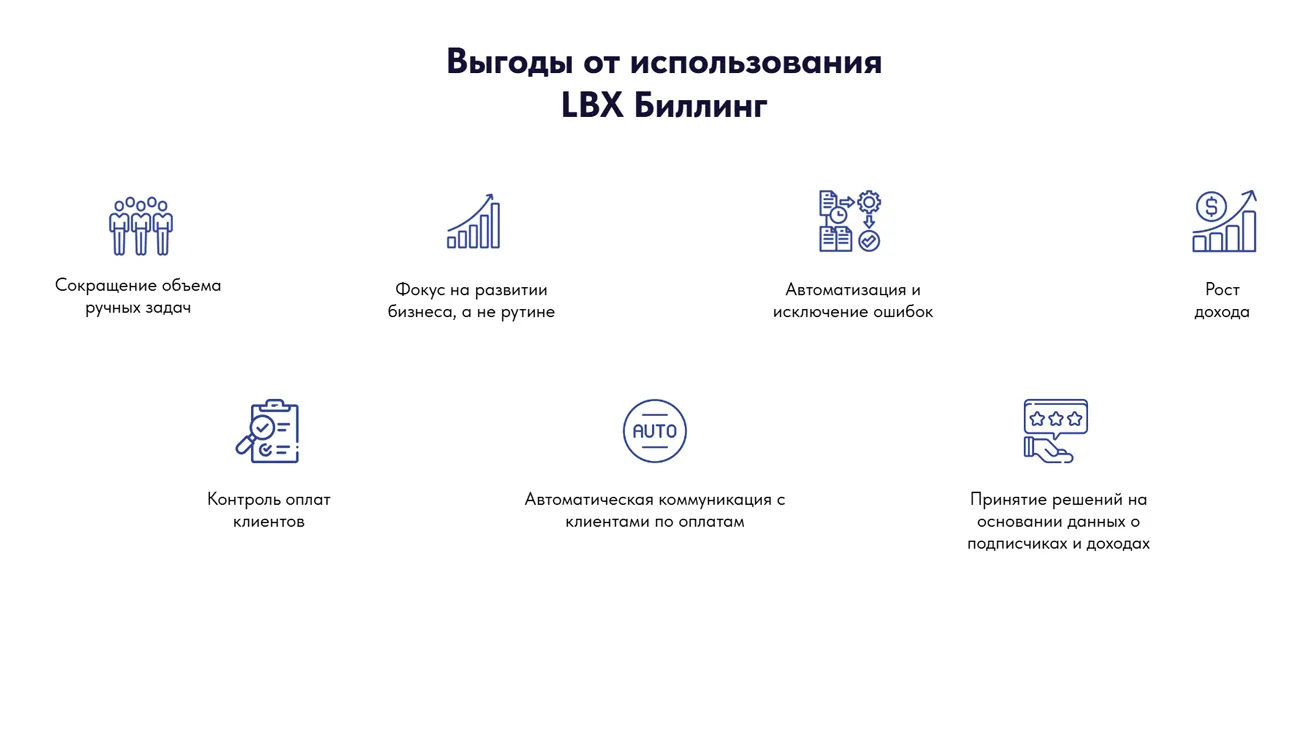 LBX Биллинг обеспечивает полный цикл работы с подписками и регулярными платежами: автоматически считает, выставляет счета, отслеживает оплаты и показывает аналитику. Помогает избежать ошибок, убрать ручную работу и не терять деньги при росте бизнеса.