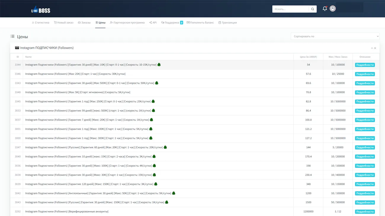 - Широкий выбор социальных сетей и пакетов услуг для продвижения аккаунтов.