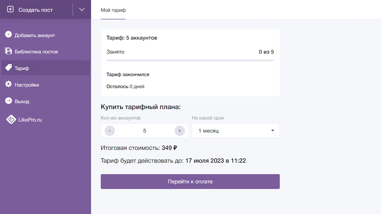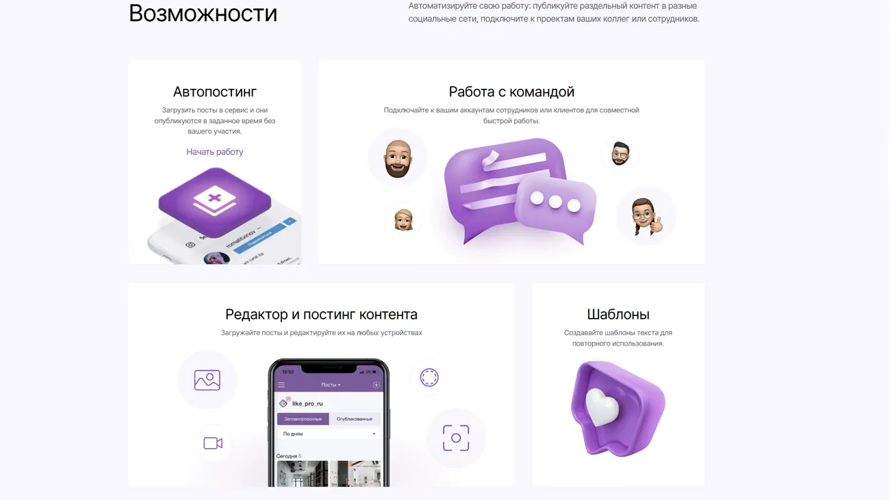Совместный рабочий процесс: LikePro позволяет вам сотрудничать с вашей командой, подключая сотрудников или клиентов к вашим аккаунтам, что способствует эффективной командной работе и позволяет быстро и скоординировано обмениваться контентом.