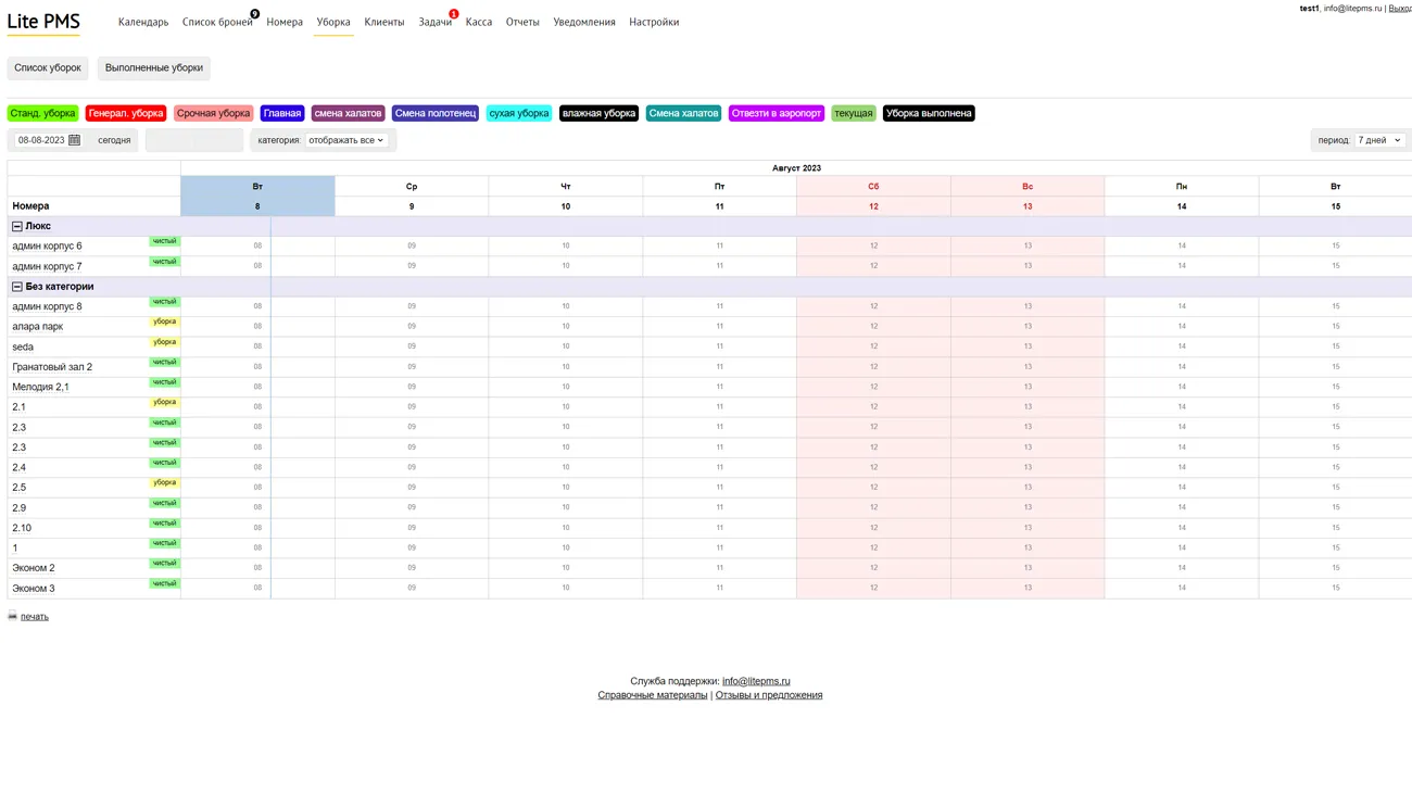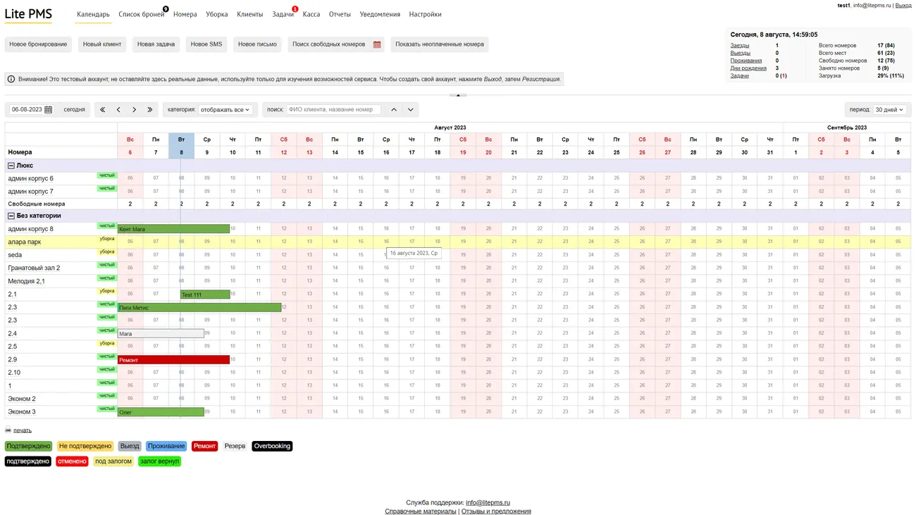 Основа сервиса - комфортная шахматка, предназначенная для отслеживания степени заполняемости комнат и статусов бронирования. За счет цветового выделения и наличия уведомлений о неоплаченных бронях он пригоден для автоматизации бизнес-процессов недвижимости для аренды на короткий срок.