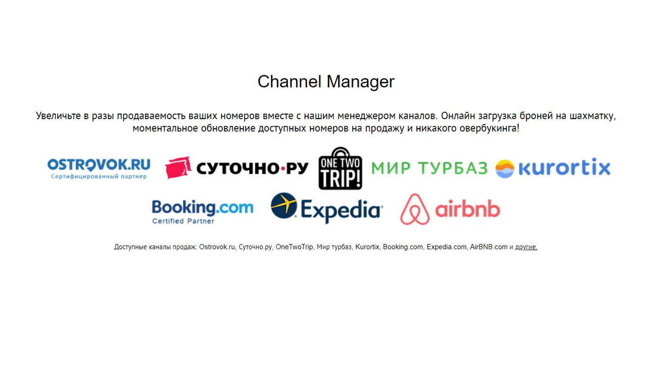 На вкладке Channel Manager расположены кнопки для интеграции с booking.com, коммуникации с Telegram, совместная работа через Bitrix24 и amoCRM. В качестве сервисов для электронной коммерции используются PayMaster, CloudPayments, PayAnyWay, Юkassa, Robokassa и другие. Предусмотрена интеграция с платежными системами различных банковских структур.
