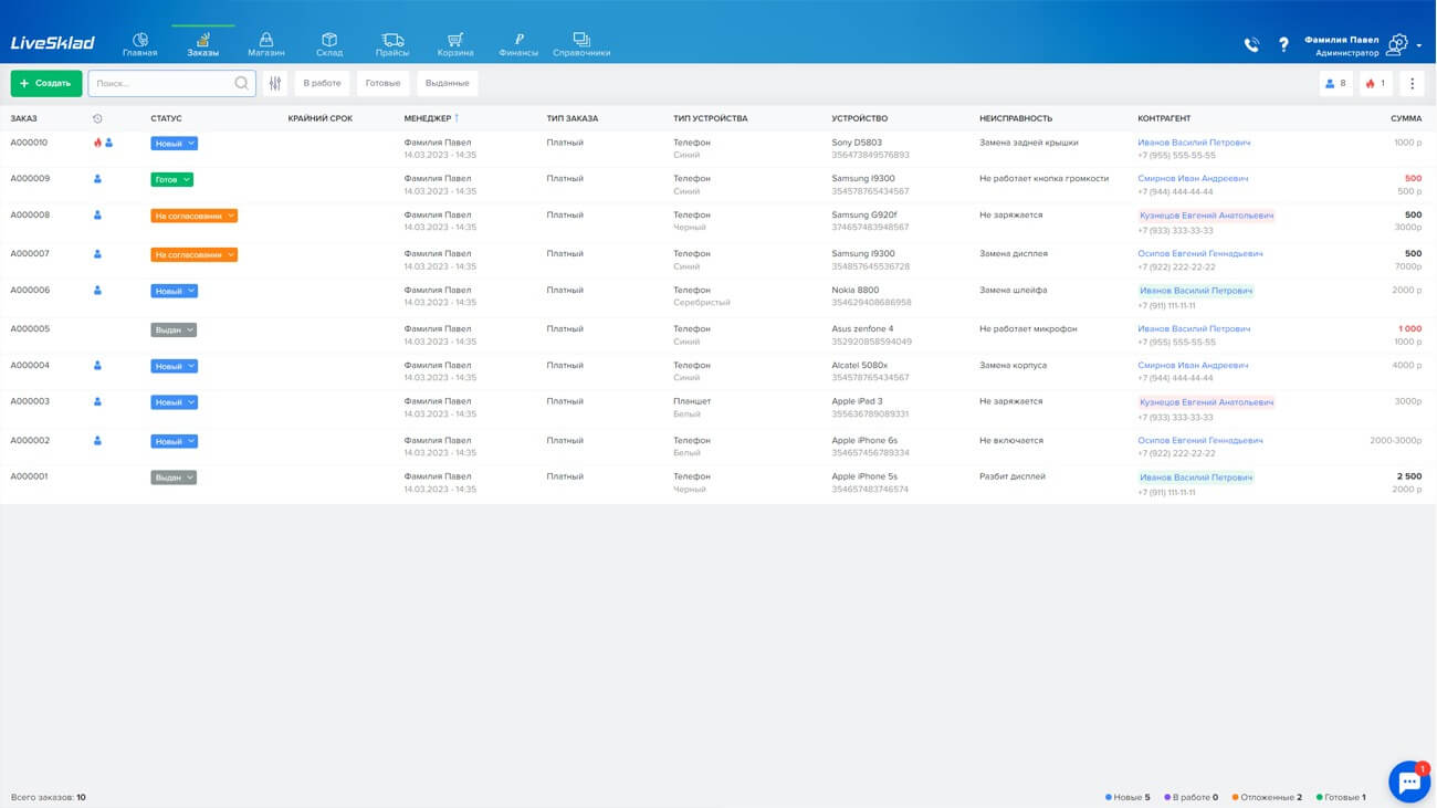 LiveSklad обеспечивает слаженную и эффективную работу любых сервисных центров от ремонтов компьютеров и телефоном до грузовых СТО. Грамотное распределение специалистов и мастеров, а так же учет запчастей и складских остатков позволяют контролировать все бизнес-процессы и анализировать данные.
