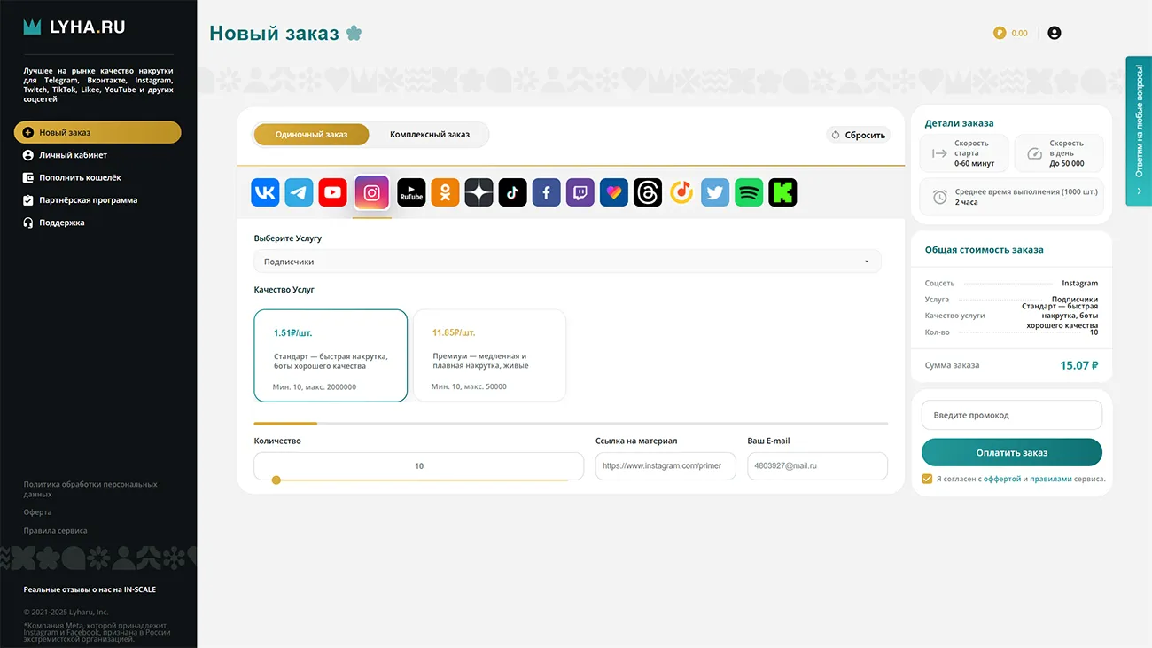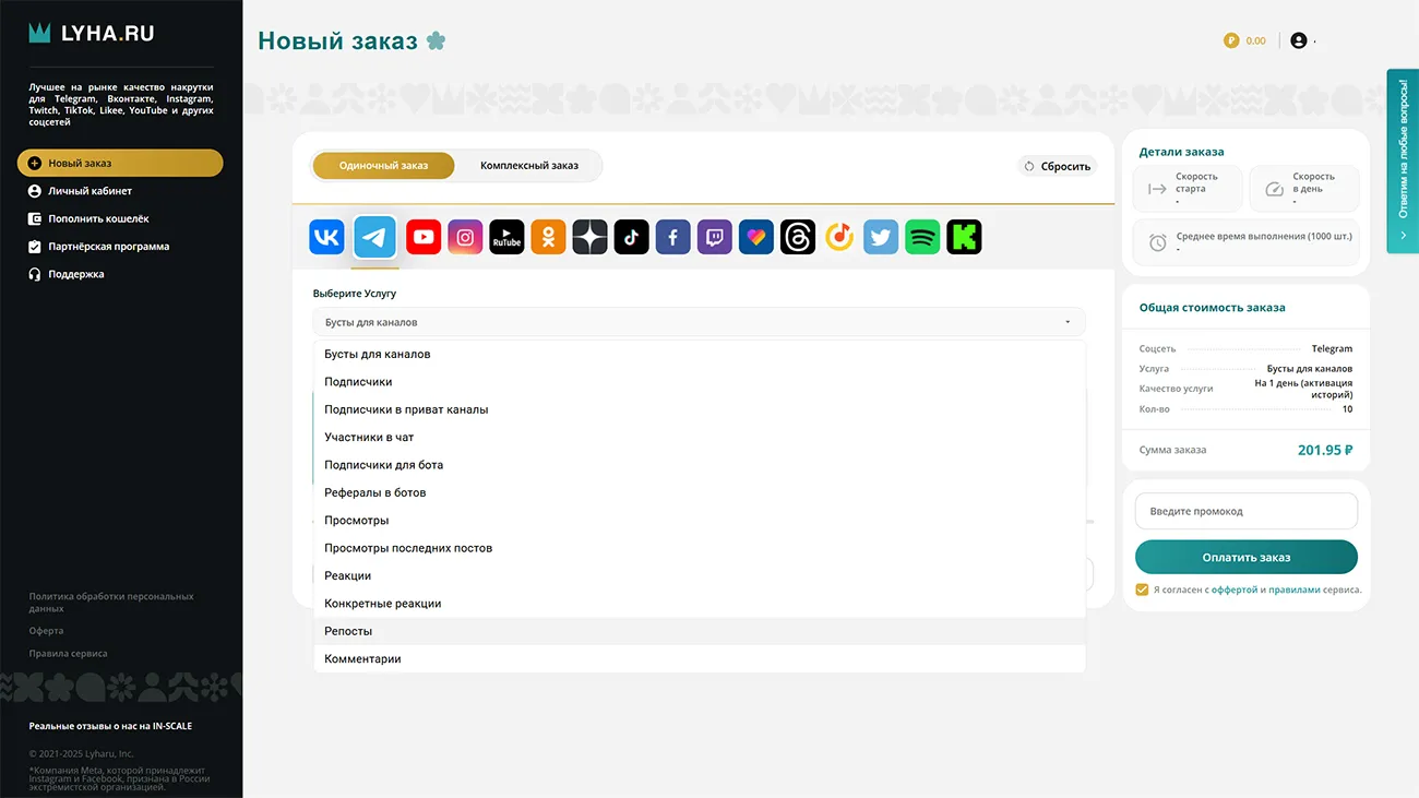 Lyha.ru — это удобный инструмент для тех, кто хочет быстро и эффективно продвигать свои аккаунты в социальных сетях, увеличивая видимость и популярность.