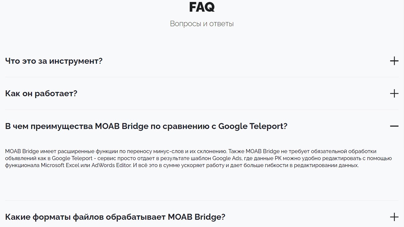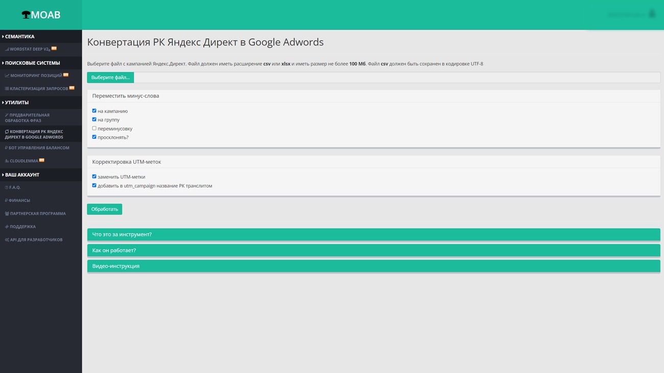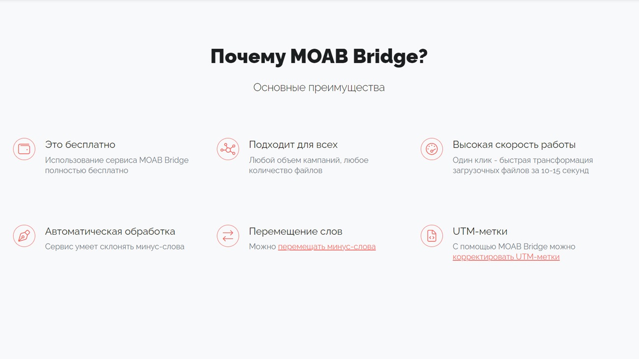 Bridge также известен своей высокой скоростью и возможностью автоматической обработки. Всего один клик - и кампании могут быть загружены и преобразованы за 10-15 секунд, а минус-слова сервис умеет расставлять автоматически. Кроме того, Bridge может перемещать минус-слова и корректировать UTM-метки, что помогает обеспечить беспроблемный процесс миграции.