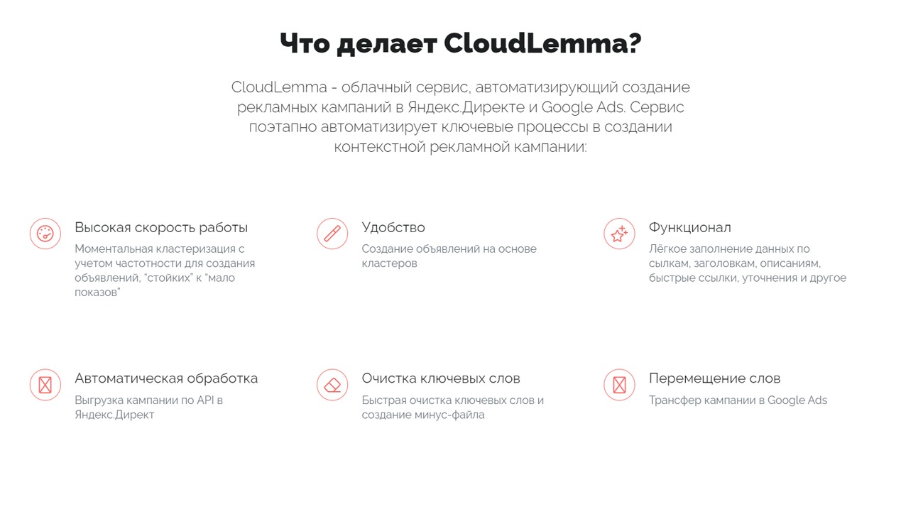 Одним из главных преимуществ МОАБ CloudLemma является 100% автоматизация загрузки кампаний в рекламный кабинет. Пользователи могут загружать свои кампании непосредственно в свои аккаунты и с легкостью переносить их в Google Ads. Кроме того, сервис автоматизирует все ключевые процессы, связанные с созданием контекстной рекламной кампании, включая кластеризацию, создание объявлений, подбор ссылок и многое другое.
