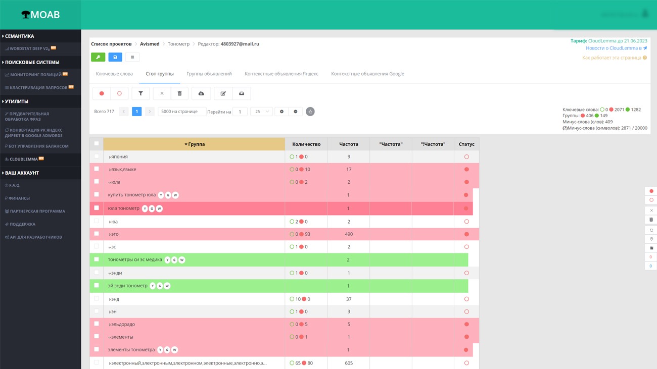 МОАБ.КлаудЛемма также предлагает функцию высокоскоростной кластеризации, которая мгновенно создает объявления, устойчивые к присвоению статуса "мало показов". Сервис предоставляет простой в использовании интерфейс для ввода данных и очистки ключевых слов, а также позволяет пользователям создавать минус-файлы с молниеносной скоростью.