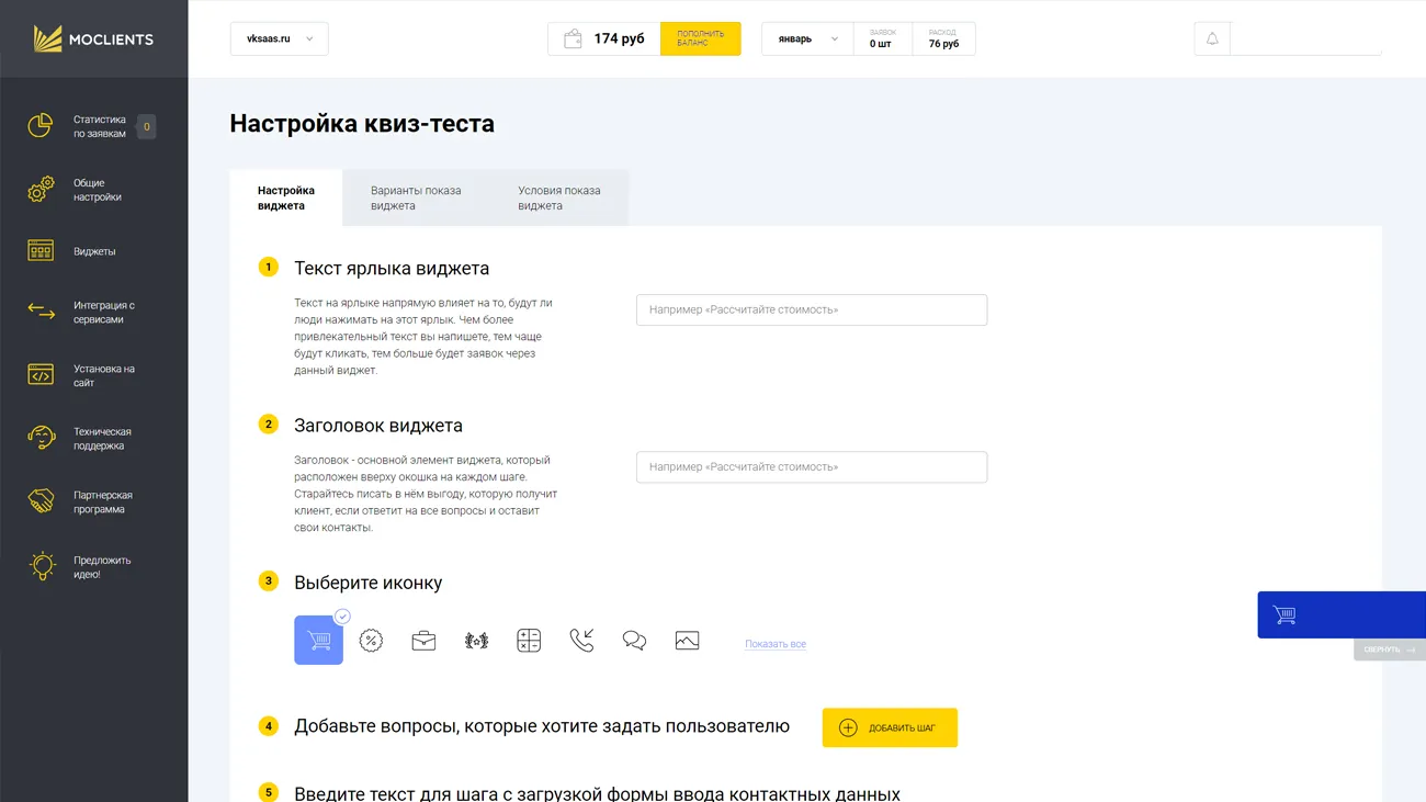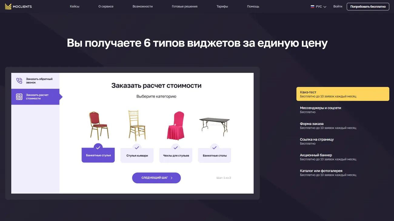 Moclients позволяет персонализировать предложения, благодаря показу различных квизов на разных страницах интернет-ресурса. Доступно создание множества тестов под разные потребности клиента.
