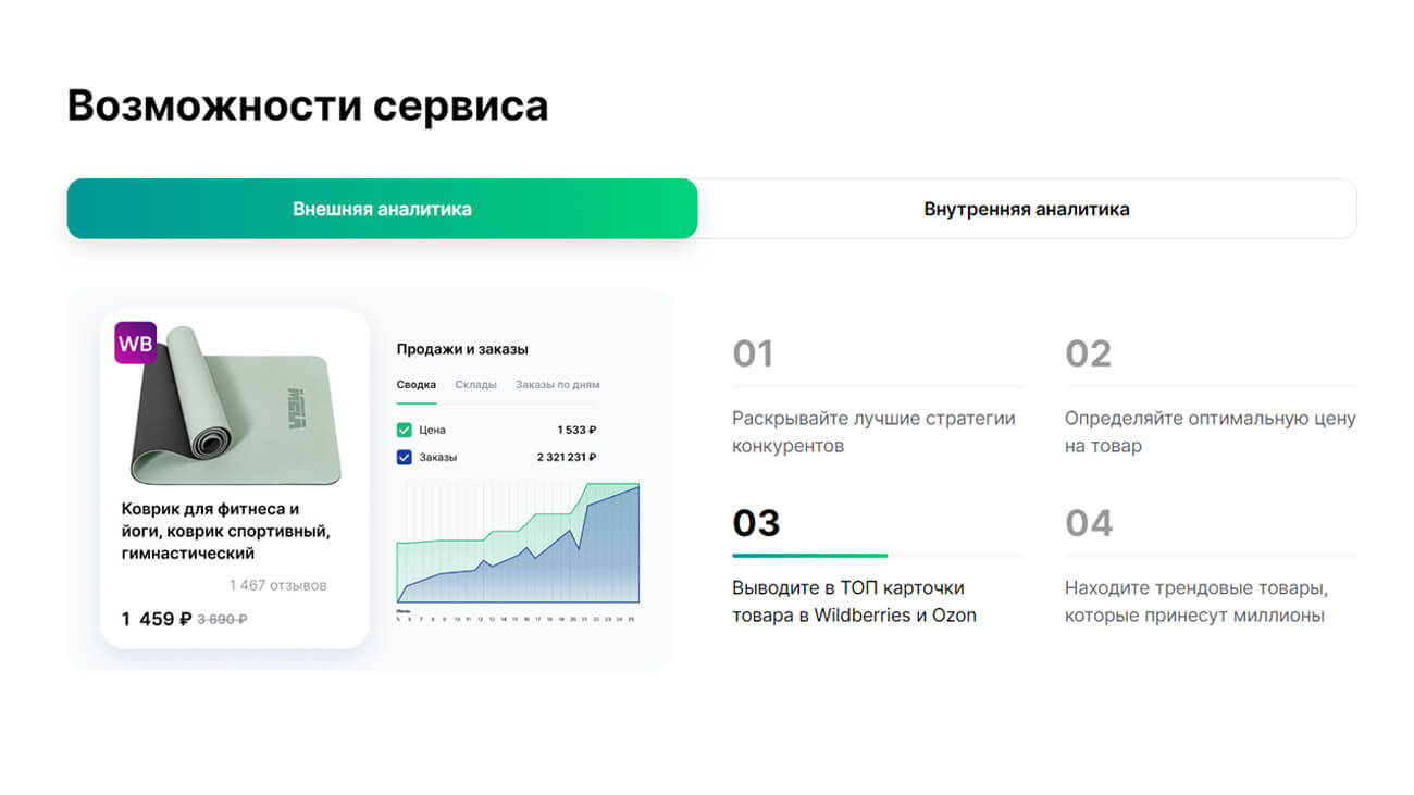 Сервис используется для оптимизации продаж магазина, а также позволяет выполнять поиск новых ниш, причём он показывает объём всей реализованной продукции. Для определения самой продающейся продукции может использоваться вывод необходимых данных за одну или две недели, а также за 30 дней сразу по трём маркетплейсам.