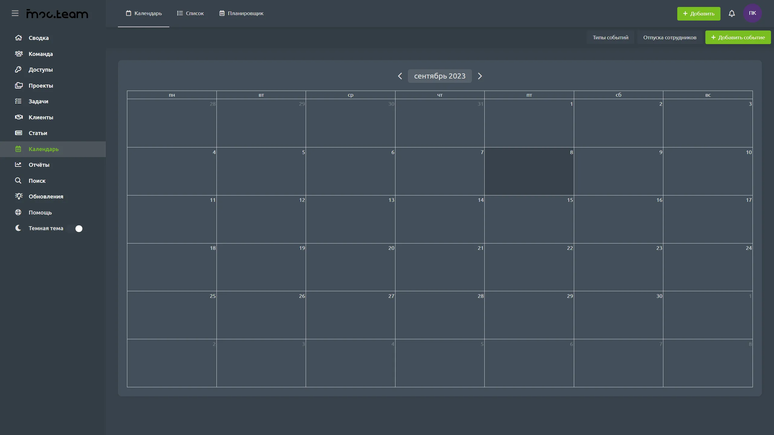 - Календарь. Позволяет настраивать напоминания о событиях, отмечать больничные и отпуска.