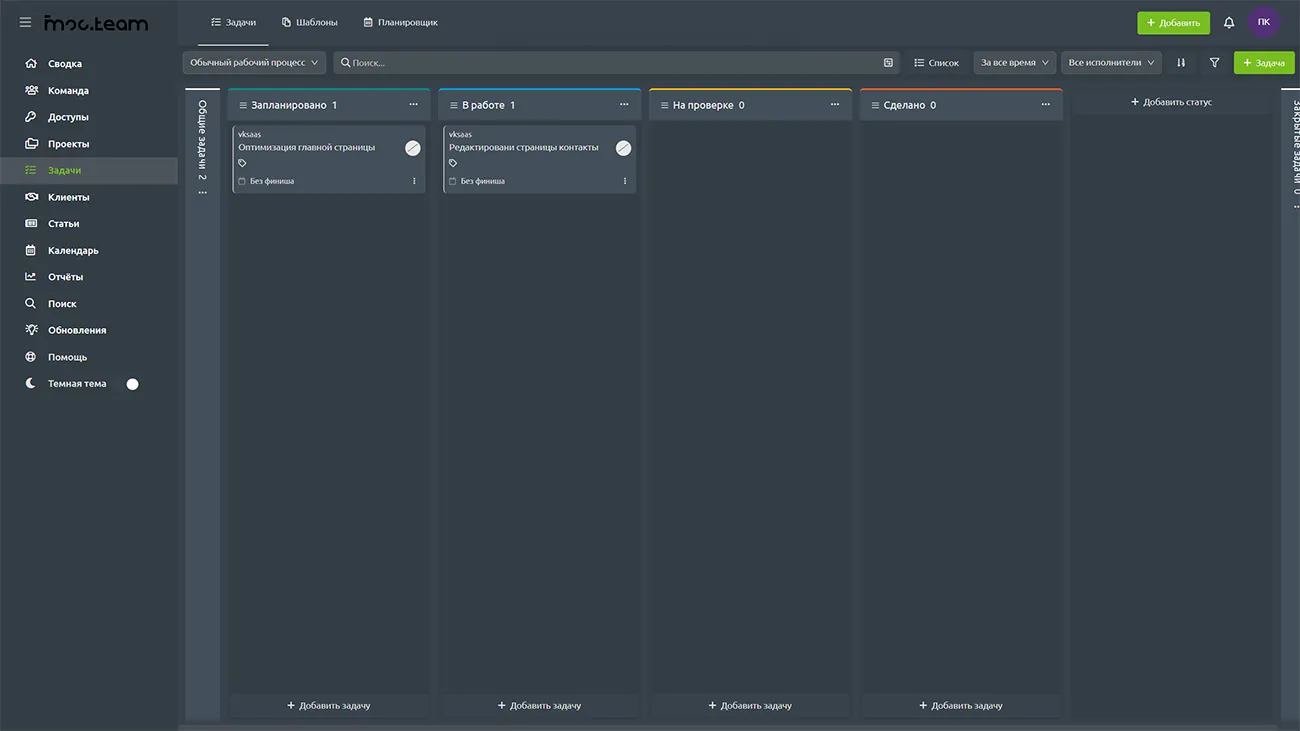 - Задача. Сводит все поставленные команде задачи, отображая ответственного исполнителя, тайминг, детализацию затрат.