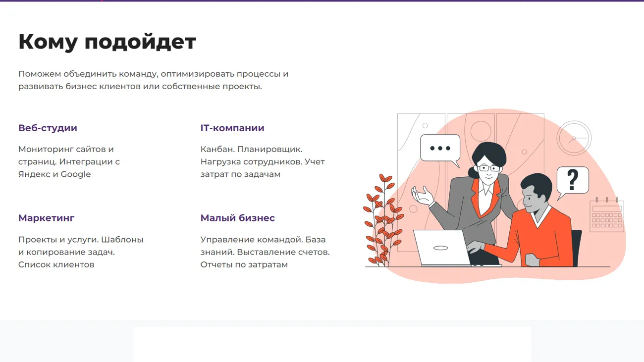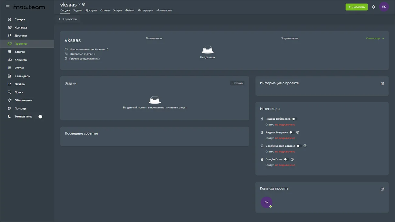 - Проекты. Вкладка отображает проекты со списком услуг, ответственными сотрудниками, задачами и услугами. Есть интеграция с Яндекс и Гугл.