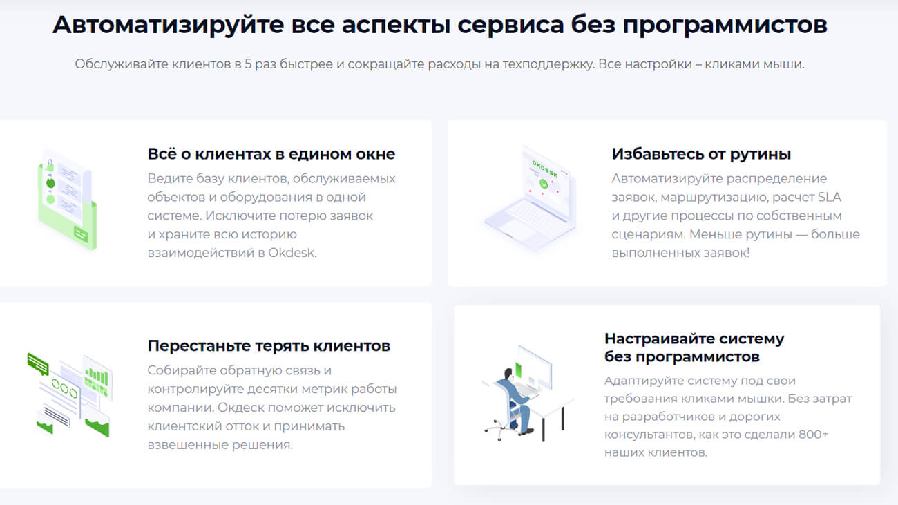 Система Okdesk по настройкам клиента составляет отдельные готовые тикеты, опираясь на фильтр характеристик. Часть запросов может быть решена и отправлена автоматически, к примеру, послания от важных клиентов и партнеров к руководителю.