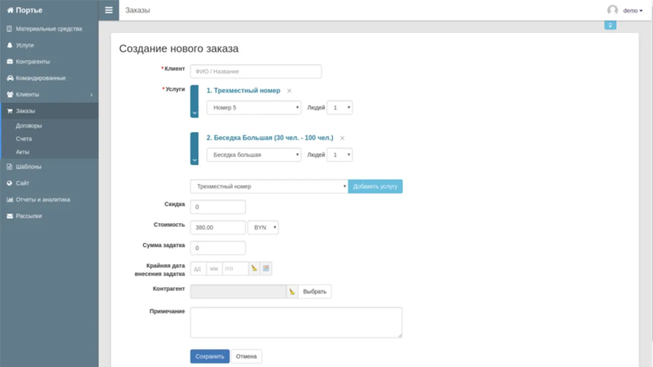 Контроль за нагрузкой номерного фонда осуществляется при помощи шахматки. В ней легко создать заказ, указав все необходимые данные о клиенте. Система сама проверит номера и брони по датам и предупредит, если номер недоступен для проживания. Также в сервисе можно редактировать бронь или дополнять заказ любыми услугами, оказываемыми в отеле. При этом программа Portie24 обладает интуитивно понятным интерфейсом для начинающих и опытных пользователей.