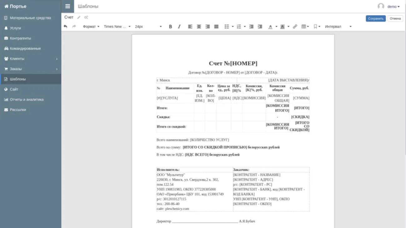 Portie24 упрощает бумажную волокиту, автоматически заполняя все формы и требуемую документацию из данных созданного заказа. Шаблоны документов доступны к редактированию, поэтому на составление договоров или выставление счетов тратится меньше времени. Сформированные документы можно выслать клиенту по электронной почте.