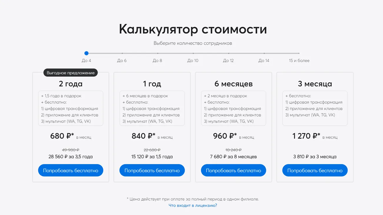 При покупке каждого тарифа, в подарок владельцы бизнеса получают бесплатное использование сервиса на заданный промежуток времени, цифровую трансформацию, приложение для клиентов и мультичат (WhatsApp, Телеграм, ВКонтакте).