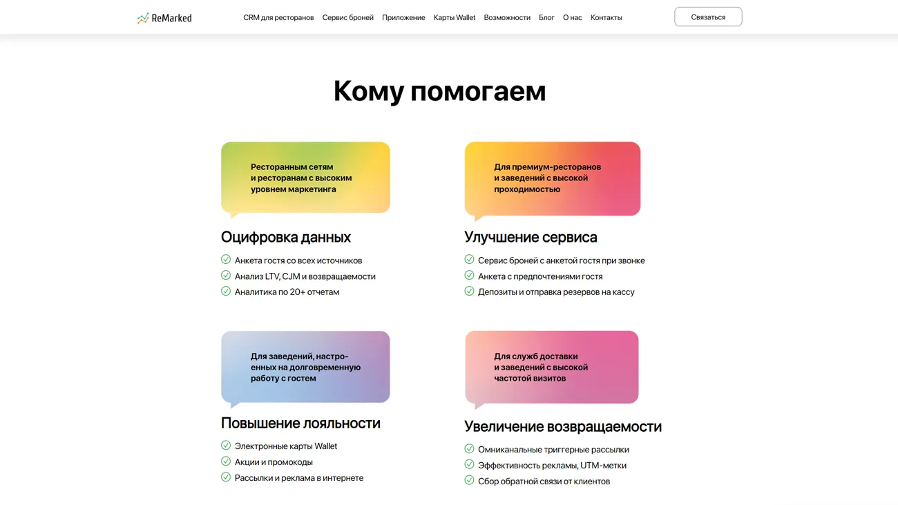 Основная цель Remarked CRM - улучшение взаимодействия с гостями и увеличение продаж. Сервис предоставляет инструменты для сегментации клиентов, проведения персонализированных рассылок и общения с клиентами на основе их истории покупок. Вы сможете проводить адресную рекламу, собирать отзывы, анализировать эффективность рекламных кампаний и многое другое.
