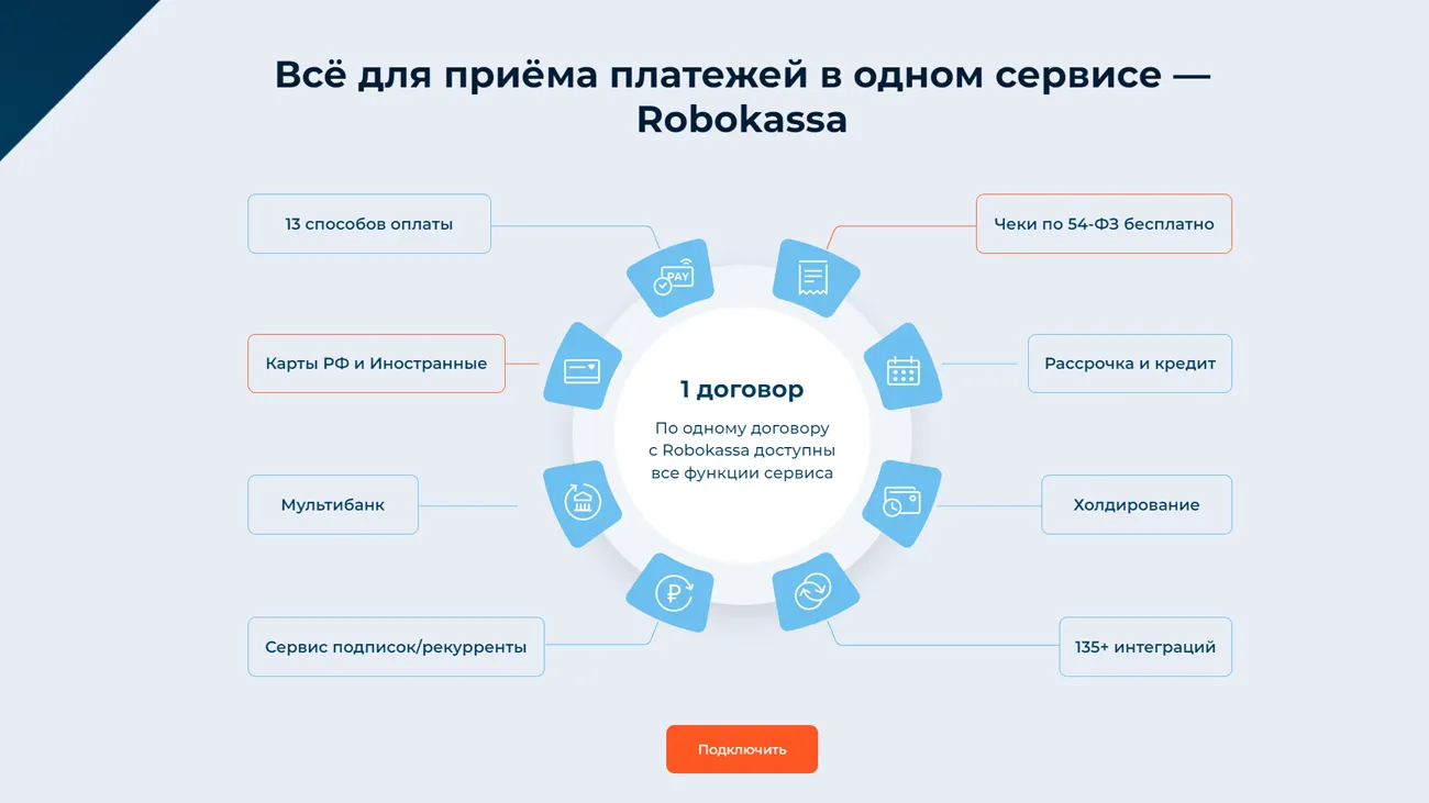 Robokassa предоставляет специальное программное обеспечение - платежный сервис, который размещается на веб-ресурсе. Главной задачей платформы является обработка онлайн платежей. Это позволяет клиентам использовать разные варианты оплаты от СБП и банковских карт, до оформления рассрочки.