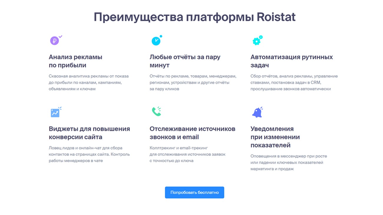 Roistat предоставляет несколько инструментов для аналитики мультиканального маркетинга, таких как сквозная аналитика, A/B-тестирование, анализ когорт и панели управления. Roistat также предлагает интеллектуальное управление ставками и автоматическую проверку настроек рекламы.