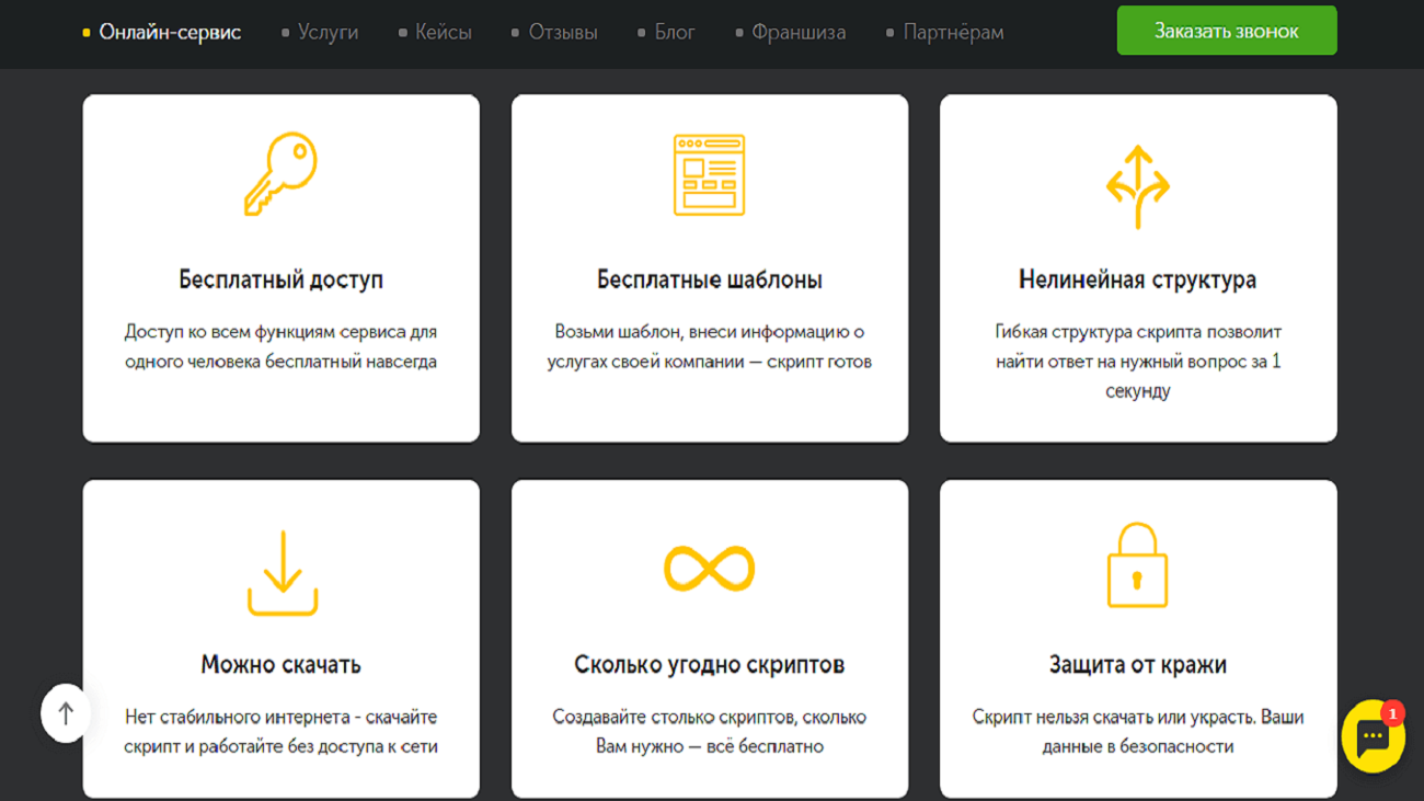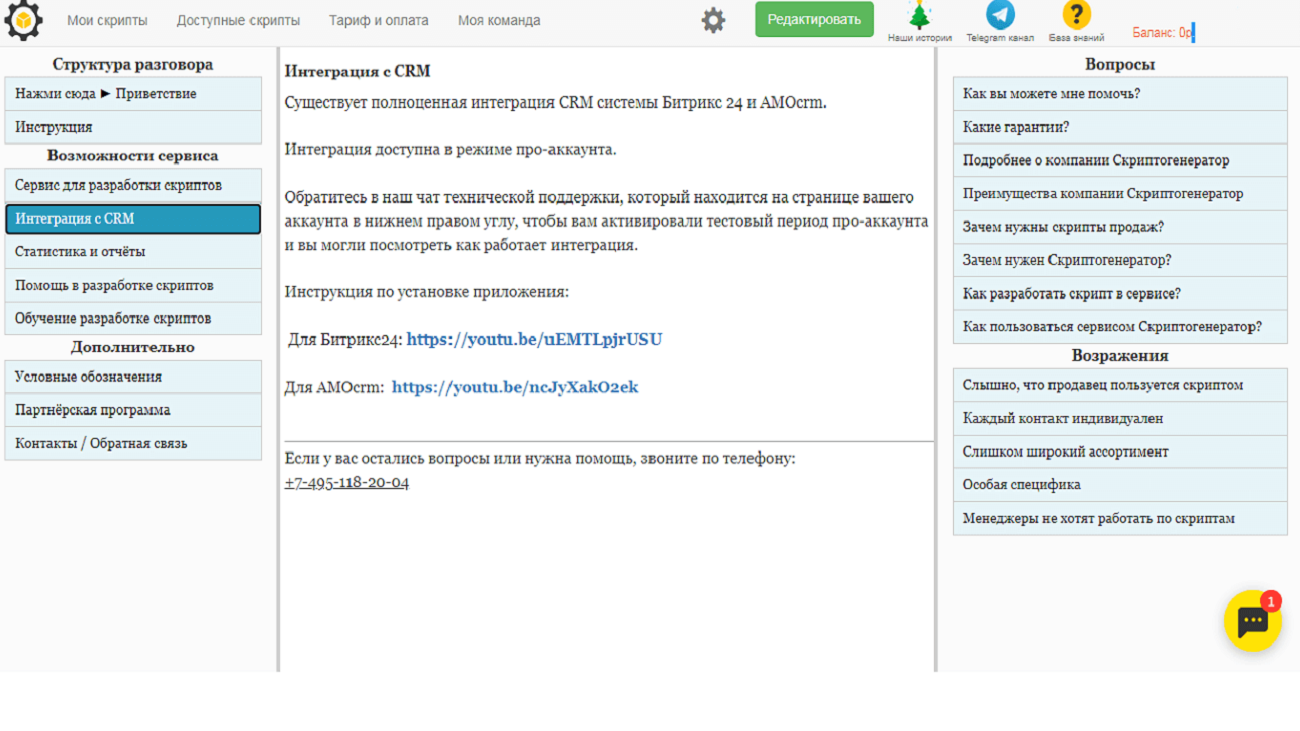 Доступ в личный кабинет клиент получает после быстрой регистрации. Интерфейс разработан максимально просто и доступно. Пользователь на главной странице видит вкладки со своими уникальными скриптами, доступными шаблонами, тарифами и списком сотрудников.