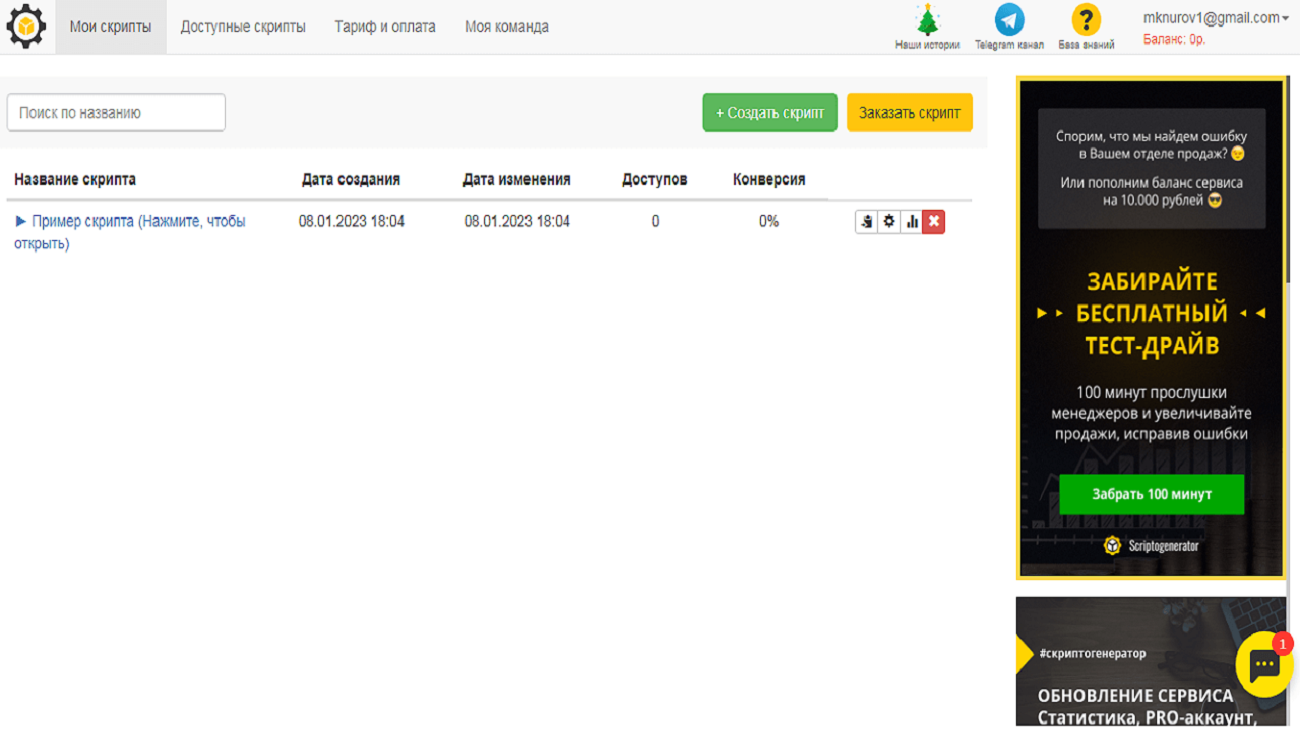 В таблице своих скриптов пользователь сидит название алгоритма, дату создания и изменения, показатель конверсии, доступы. По клику доступна статистика, внесение изменений, копирование и удаление шаблона.