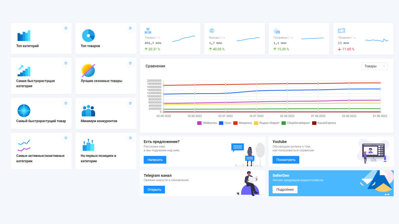 Оперативное отслеживание изменений с помощью SellerFox теперь возможно по ценам, ключевым словам и продавцам. Благодаря этому сервису анализируется выручка и прогнозируется популярность изделий в будущем. Сегодня представленная экосистема SellerDen может покрыть многие вопросы непосредственных поставщиков маркетплейсов, что становится возможным из-за продуманного функционала.