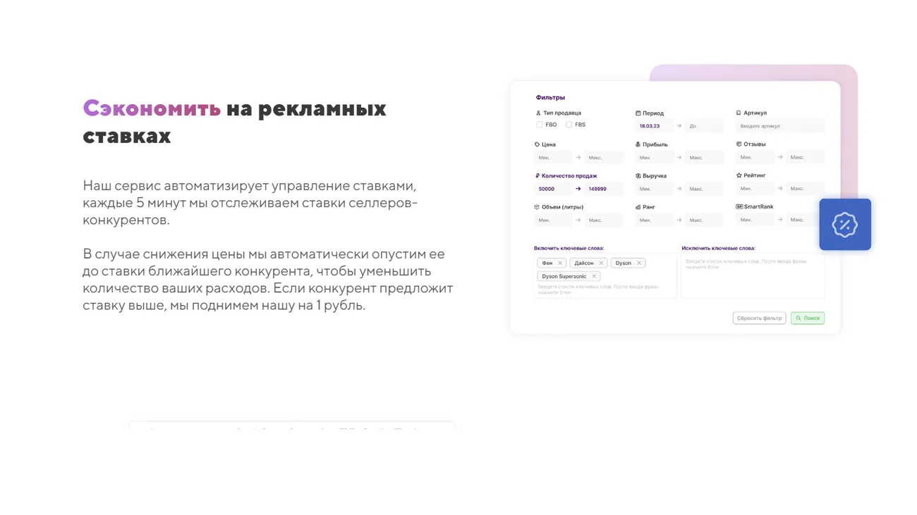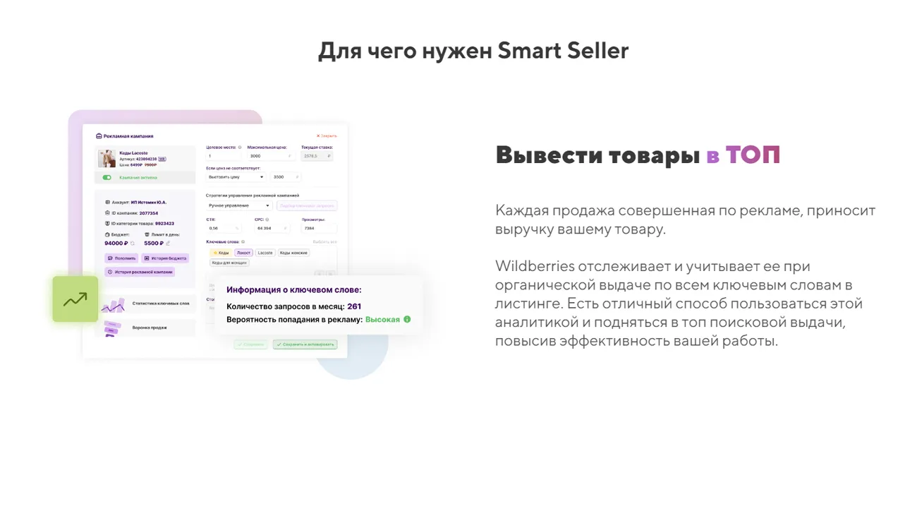 Личный кабинет Smart Seller предназначен для увеличения объема продаж на маркетплейсах. Сервис предоставляет пользователю подробную аналитику по запущенным рекламным кампаниям. Искусственный интеллект автоматически ставит и регулирует ставки на позиции, ориентируясь на ценовую политику ближайших конкурентов. В личном кабинете можно установить ограничения для биддера, определив диапазоны для всех товаров или отдельных позиций, либо настраивать ставки вручную.