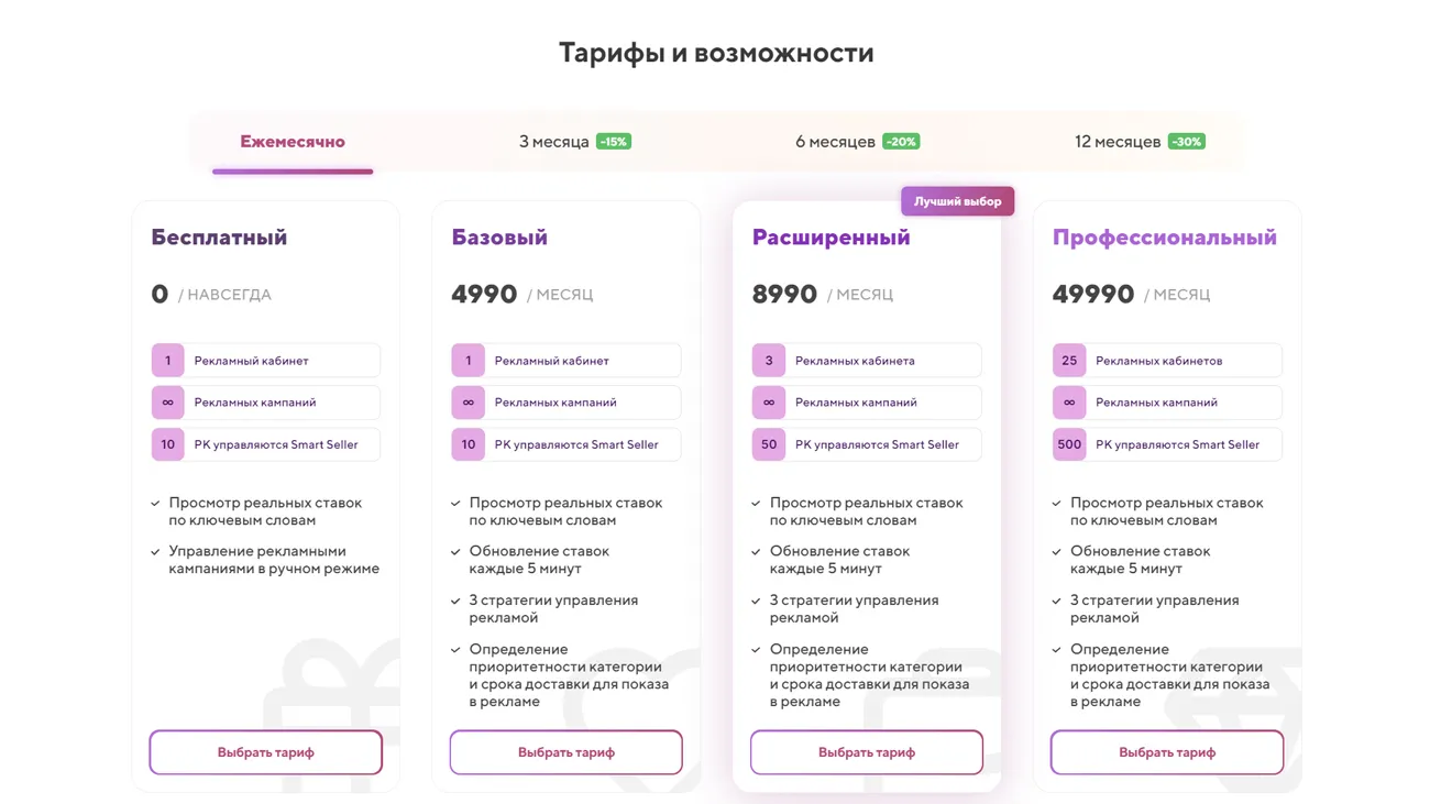 Для пользователей сервиса разработана тарифная сетка, которая учитывает продажи на Яндекс Маркете или Wildberries за 2 предыдущих месяца. Новичкам доступен пробный период – до 14 дней бесплатно. Также Smart Seller предлагает воспользоваться партнерской программой, которая позволяет получать дополнительный доход за приглашенных пользователей.