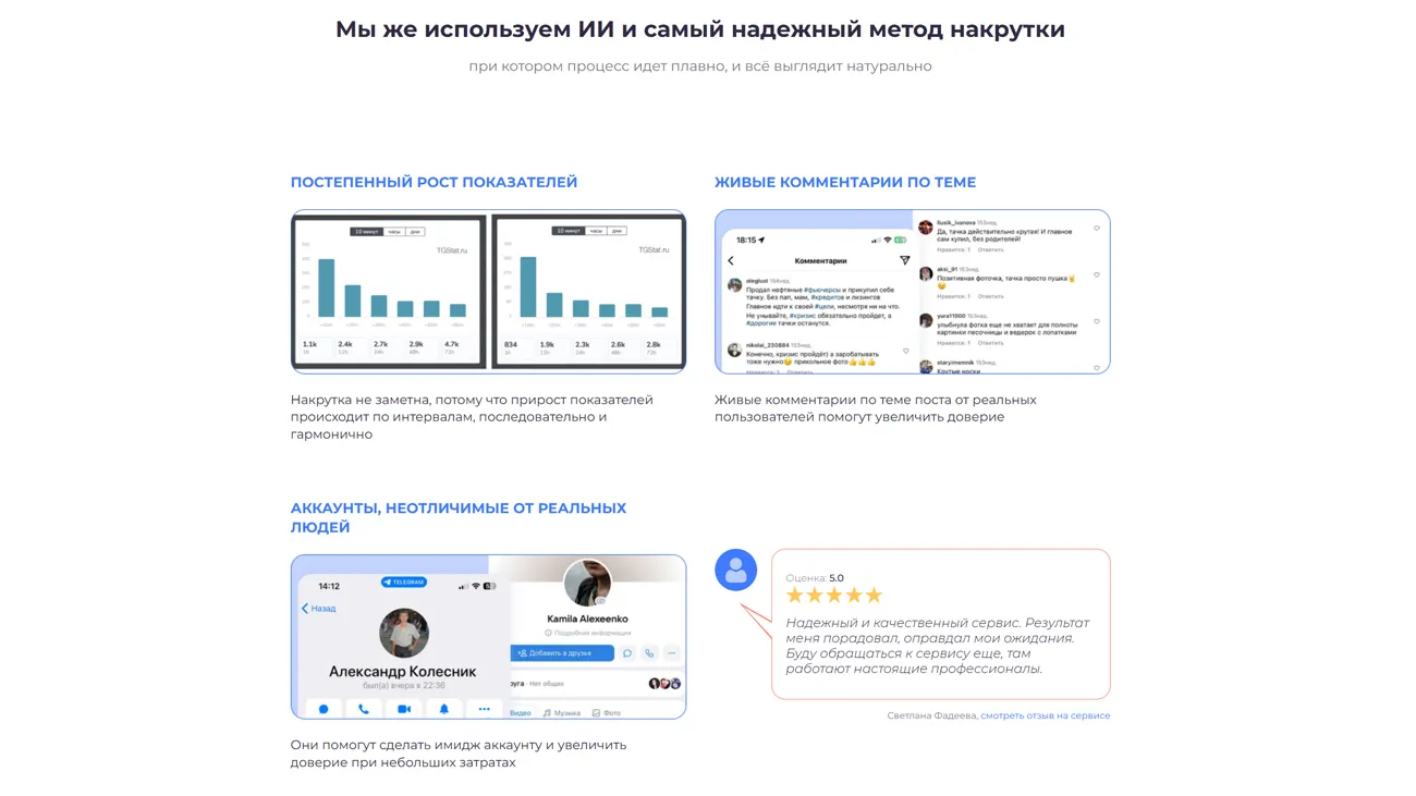 Главное преимущество сервиса – постепенный естественный рост показателей, живые комментарии по теме от реальных пользователей социальных сетей. Система позволяет не только повысить количество показов и увеличить аудиторию, но и запланировать исход голосований в группах и чатах. Все действия по накрутке автоматизированы и не требуют контроля.