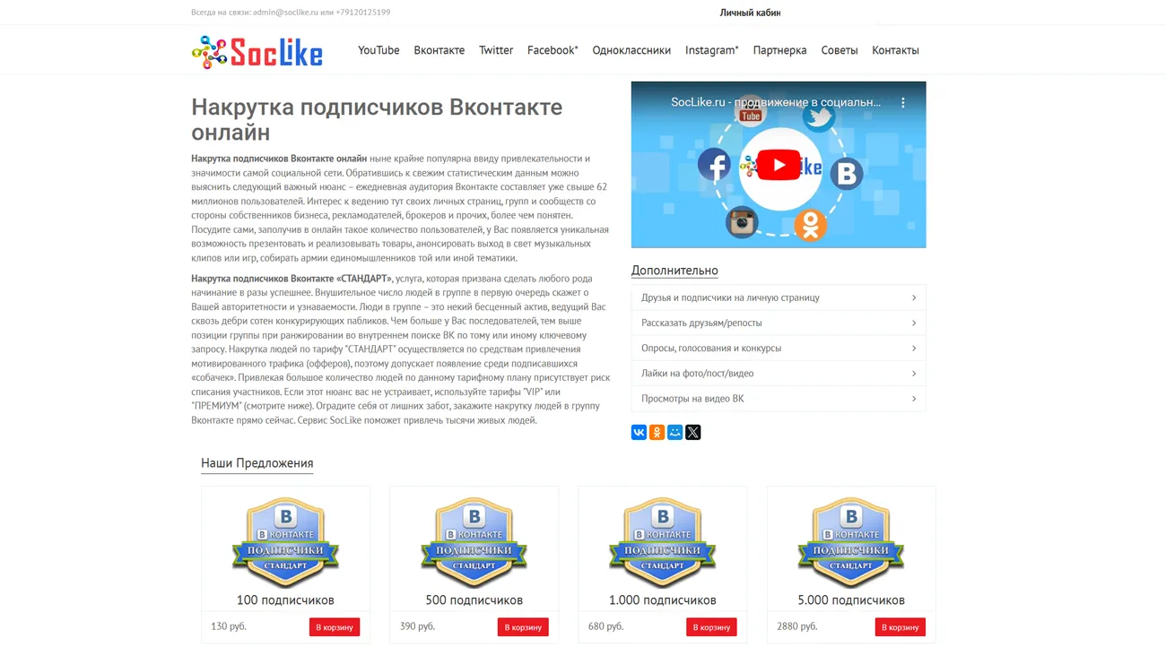 - Разнообразие услуг: SocLike предлагает услуги по накрутке подписчиков, лайков, просмотров, комментариев и репостов. Например, для YouTube доступны накрутка живых подписчиков и просмотров, для Instagram — активные лайки и фолловеры, а для ВКонтакте — комплексная поддержка продвижения групп и страниц.